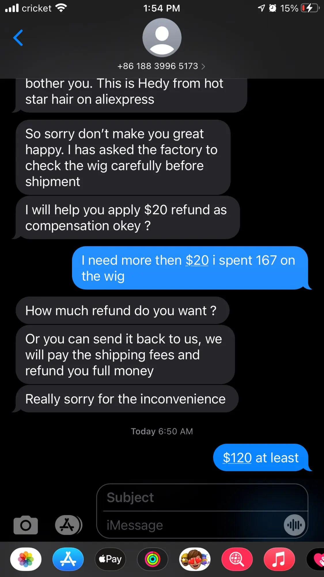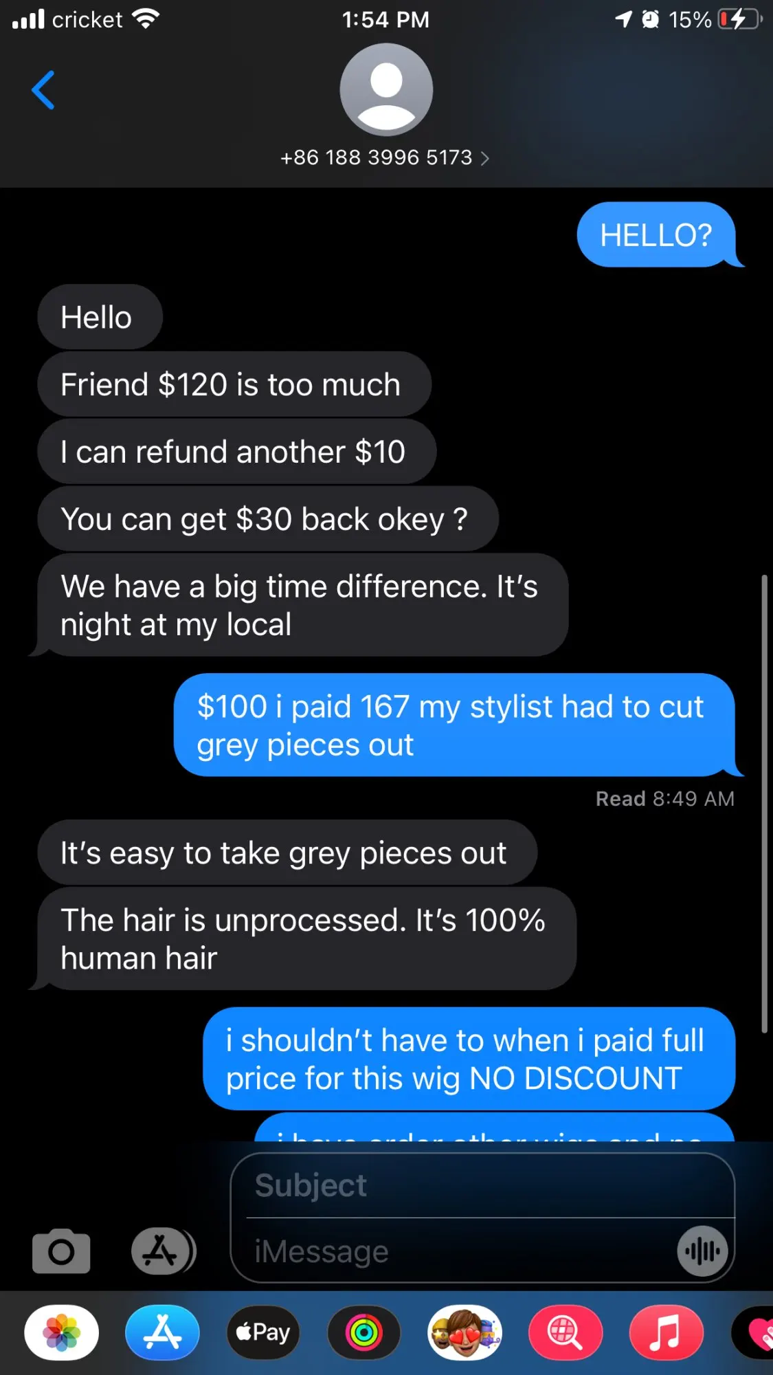 Мне не нравятся волосы. Я заказал 24 дюйма, и это было технически точно 24 дюйма. При измерении до самых тонких концов. После того, как тонна назад и вперед с продавцом, она сказала, что вернет мне деньги, если я отправлю товар обратно. После оплаты, чтобы отправить волосы на международном уровне, я отправил ей все детали доставки и квитанции, необходимые, чтобы вернуть мне часть доставки. Но через 2 дня она все еще задает мне бесострые вопросы, чтобы задержать процесс ....... Не беспокойтесь о покупке у этого продавца, потому что волосы тонкие и процесс возврата денег-кошмар