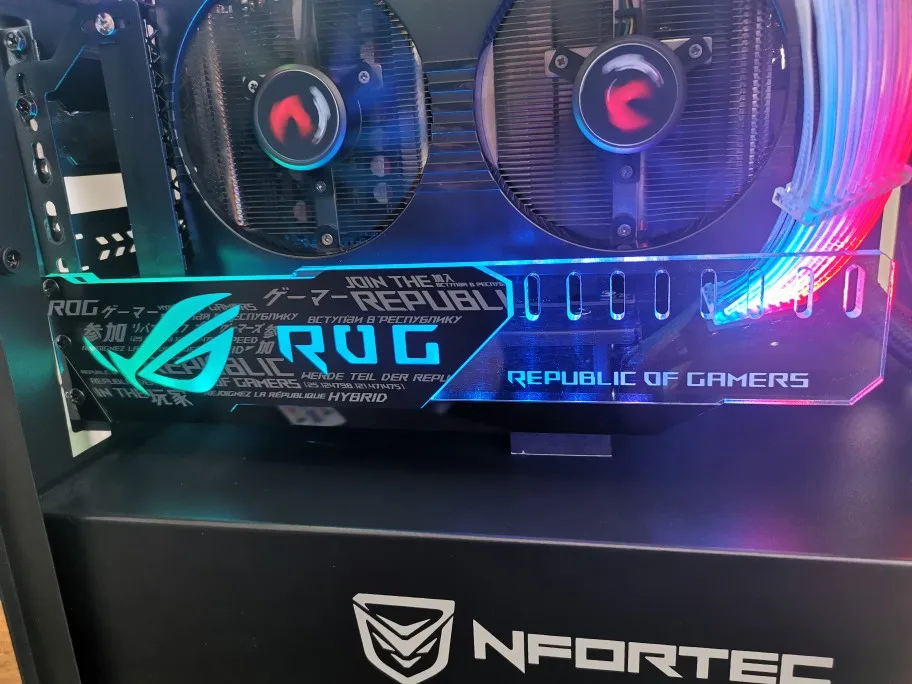 Очень хороший кронштейн графического процессора по цене. У него были некоторые царапины на черной части и клей виден сзади, но в целом он ощущается относительно высокого качества. Возможно, из-за моего чехла, кронштейн не полностью прямой, он немного идет к передней части. В качестве кронштейна это может не быть идеальным, потому что привинчиваемая часть, которая поддерживает графический процессор, не очень стабильная, хотя она работает. Однако rgb-лента хорошо работает и хорошо освещает кронштейн. Доставка была невероятно быстрой, она прибыла всего через 8 дней после заказа. Хорошо упаковано, чтобы защитить его во время доставки.