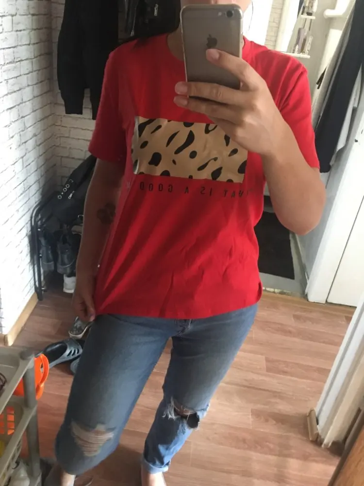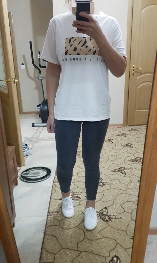 Хорошая футболка, сам материал конечно дешёвенький, но за счёт стильной аппликации смотрится хорошо.