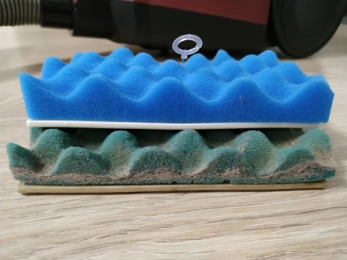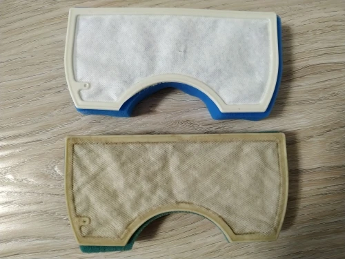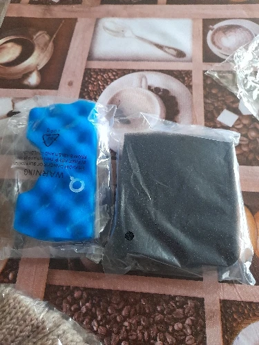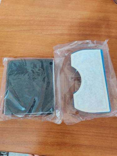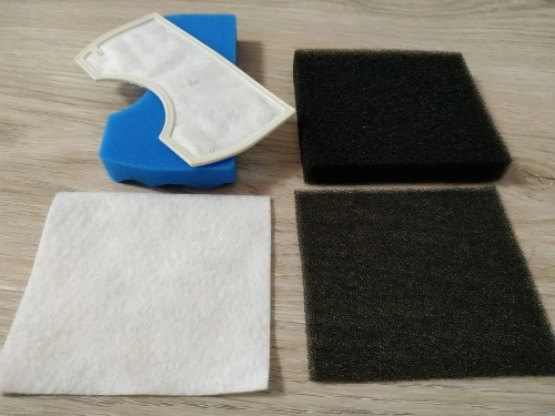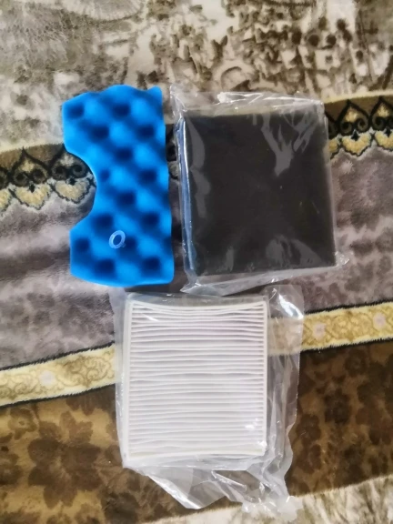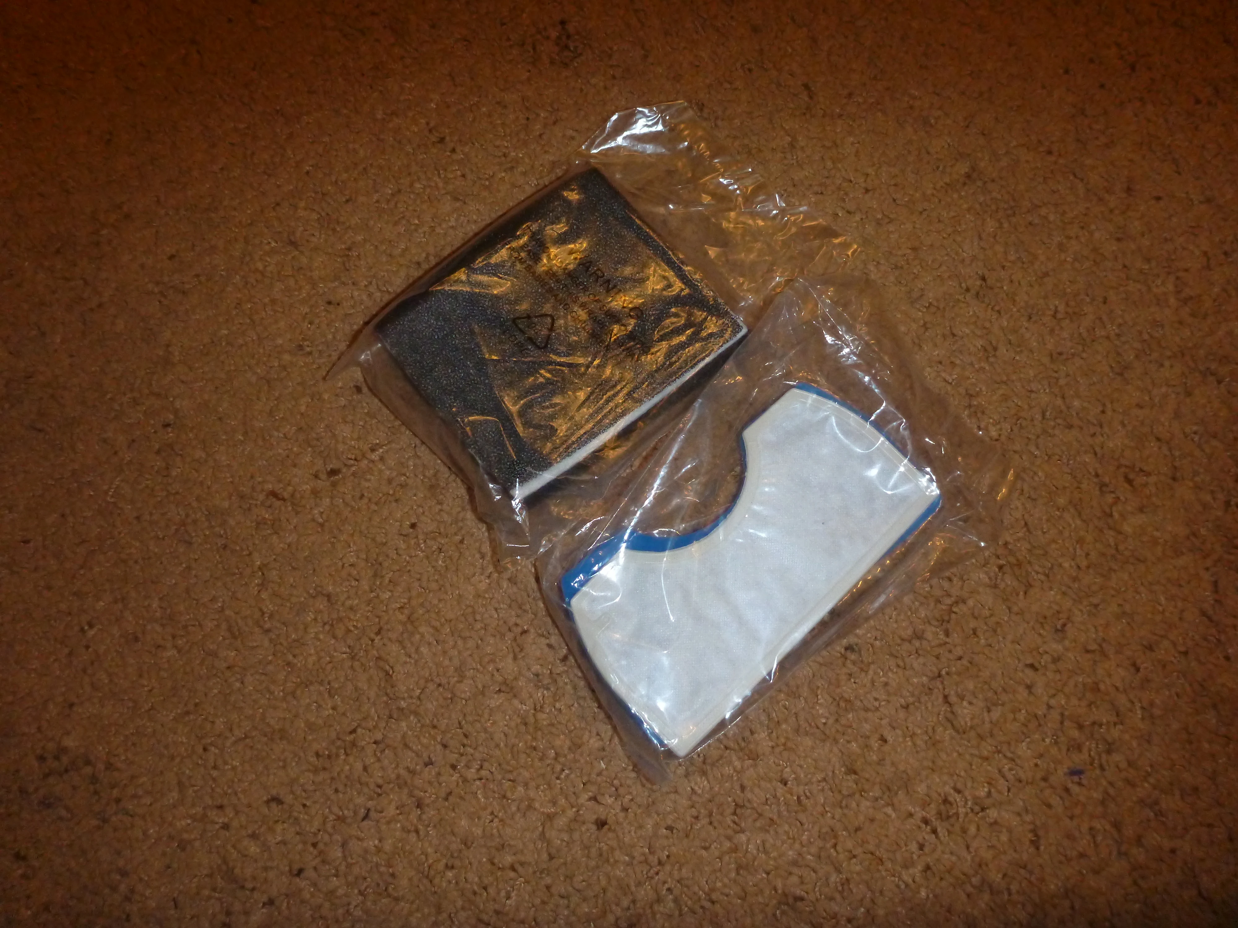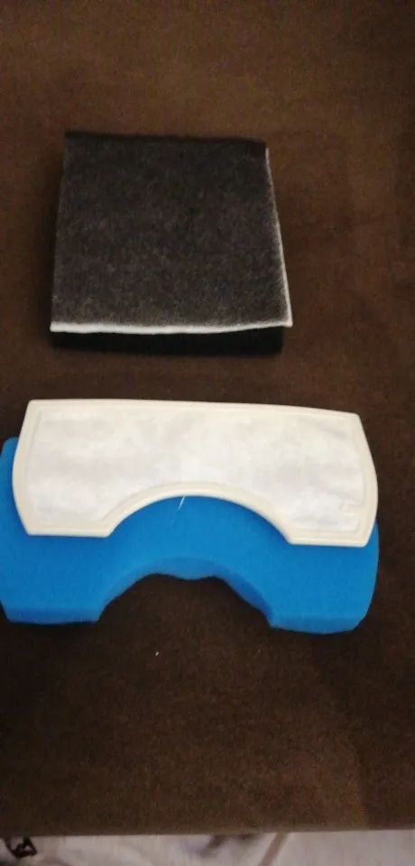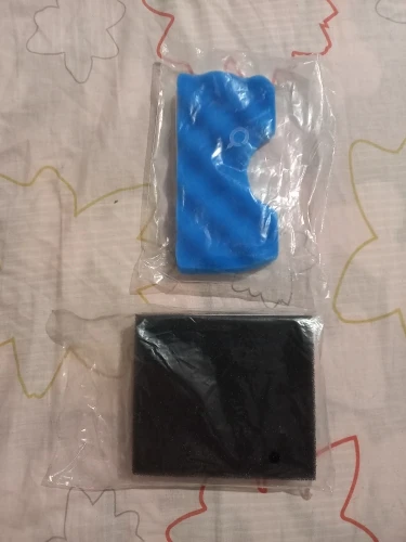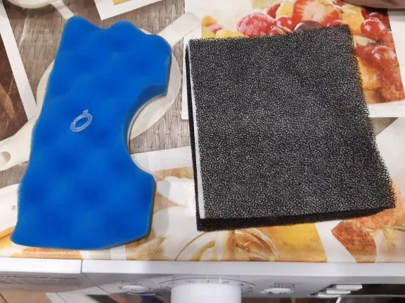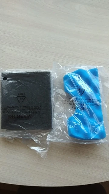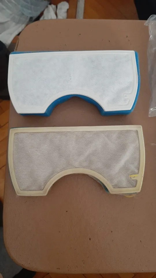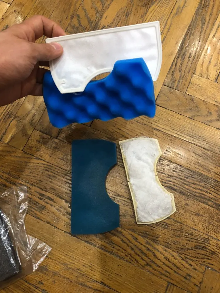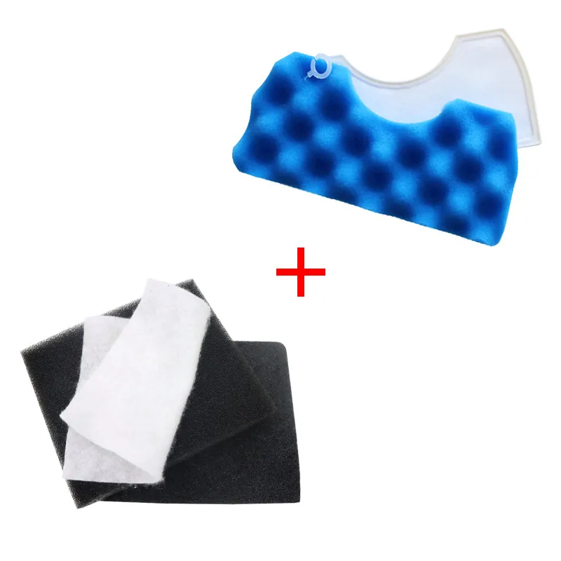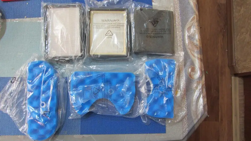 В комплекте: 1. голубая губка. 2. фильтр такой же формы (крепится к голубой губке). 3. прямоугольная губка. 4. прямоугольный фильтр (похоже на войлок). 3 и 4 ставятся на "выходе", сзади пылесоса. 5. очень тонкая прямоугольная губка (не знаю для чего, может, на смену войлоку?). Всё подходит. "Родная" прямоугольная губка несколько плотнее, выглядит надёжнее новой. Новая голубая губка более толстая, чем "родная".