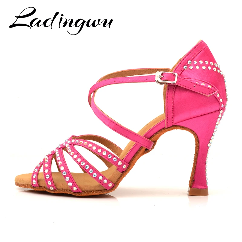 Женские туфли для латиноамериканских танцев Ladingwu, розовые и красные атласные туфли с мягкой подошвой, стразы для сальсы, Красного граната