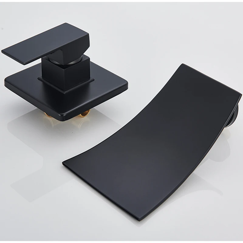 Смеситель для раковины в ванную комнату, черный хромированный кран для раковины, носик водопада, настенное крепление из латуни, одна ручка, смеситель для раковины с поворотом на 180 градусов