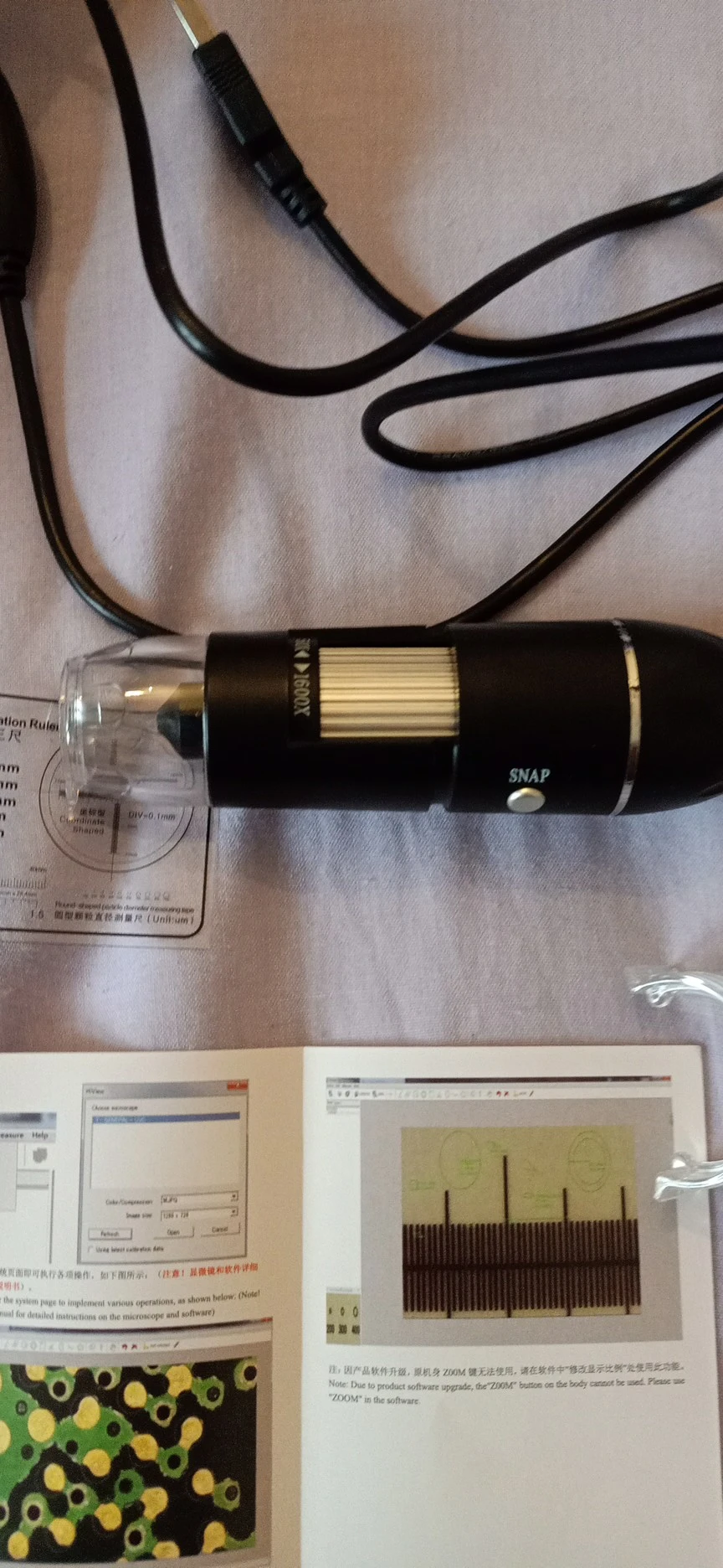 Очень хороший микроскоп. Описание точное. Из недостатков конкретно моей посылки. Поцарапана пластмасска, которая прикрывает объектив. Небольшое чёрное пятно на изображении. Не знаю что это, но оно не мешает. На фото увеличение бумаги