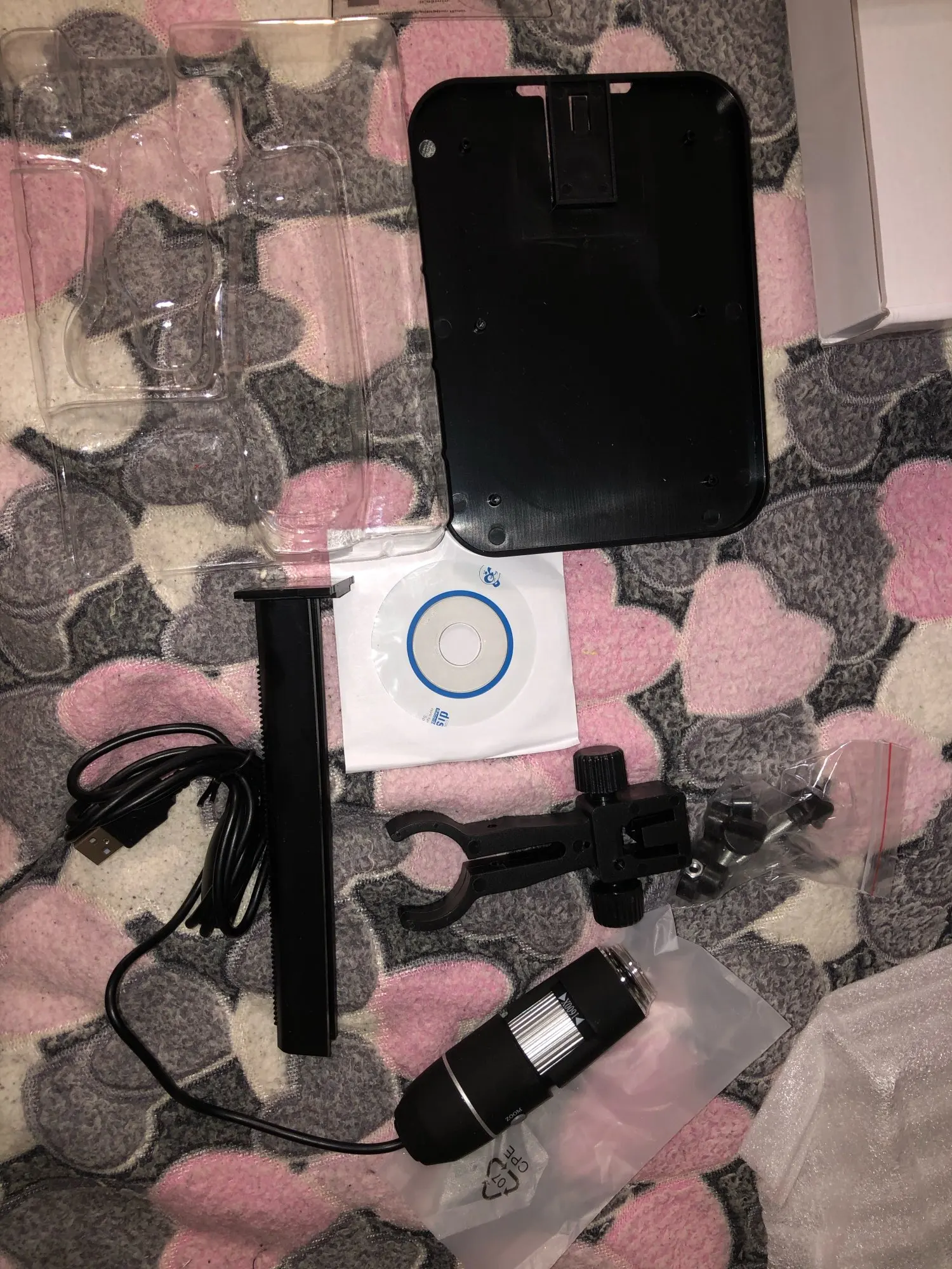 Коробка пришла помятая. Микроскоп пока не проверяла. В описании не нашла какие именно переходники идут в комплекте. Для айфона переходника нет, так что пока не подключала. Надеюсь что пришёл рабочий. Посылка дошла за три недели.