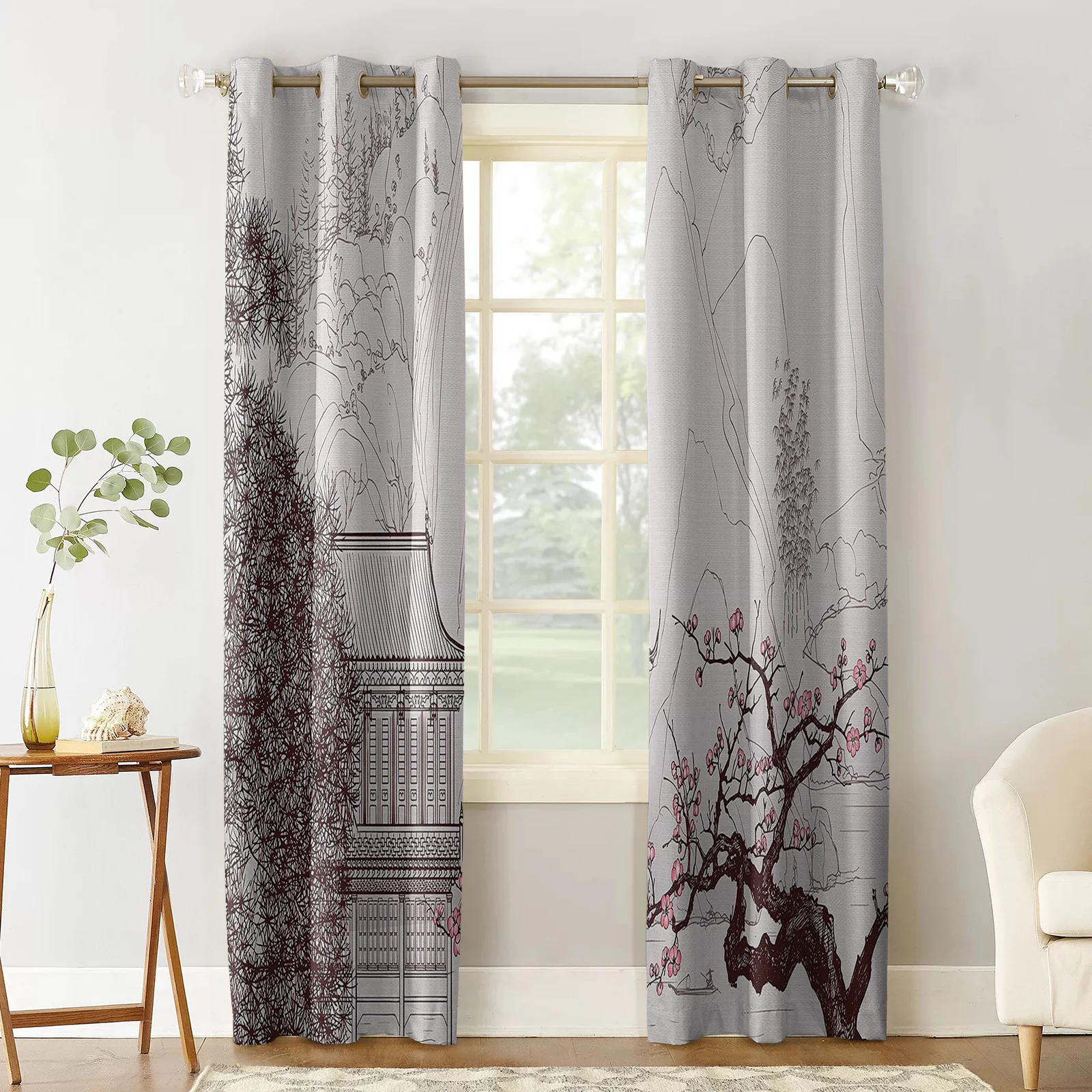 Азиатские шторы, китайская религиозная культура, храмы, Сакура, елки и горы, пагода, Восточный, гостиная, спальня, занавески на окна