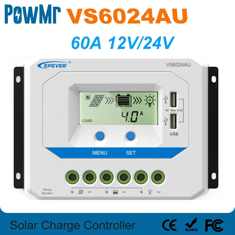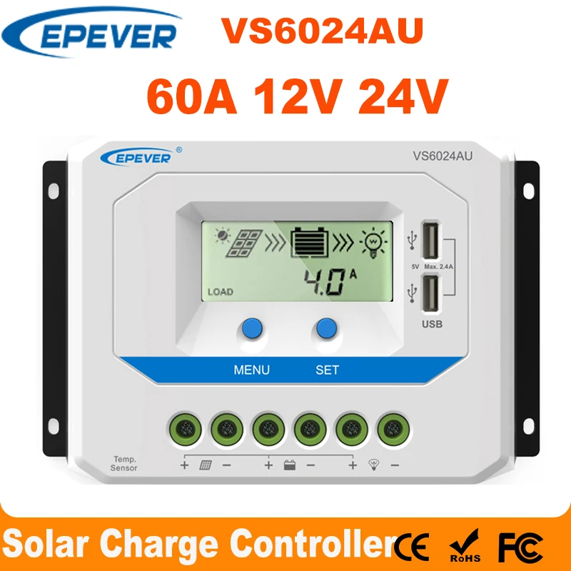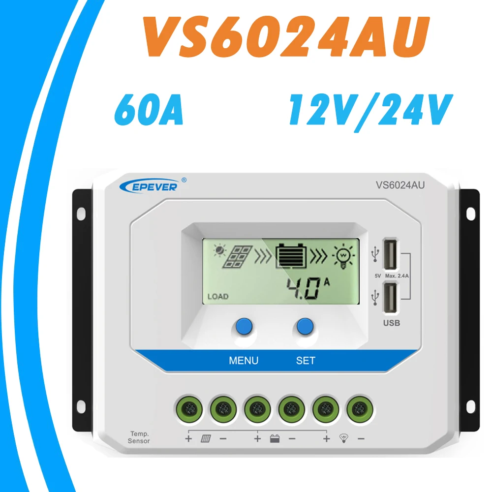 EPEVER 60A Солнечный контроллер 12 В 24 в авто VS6024AU ШИМ Контроллер заряда со встроенным ЖК-дисплеем и двойным USB 5 В портом EPsolar