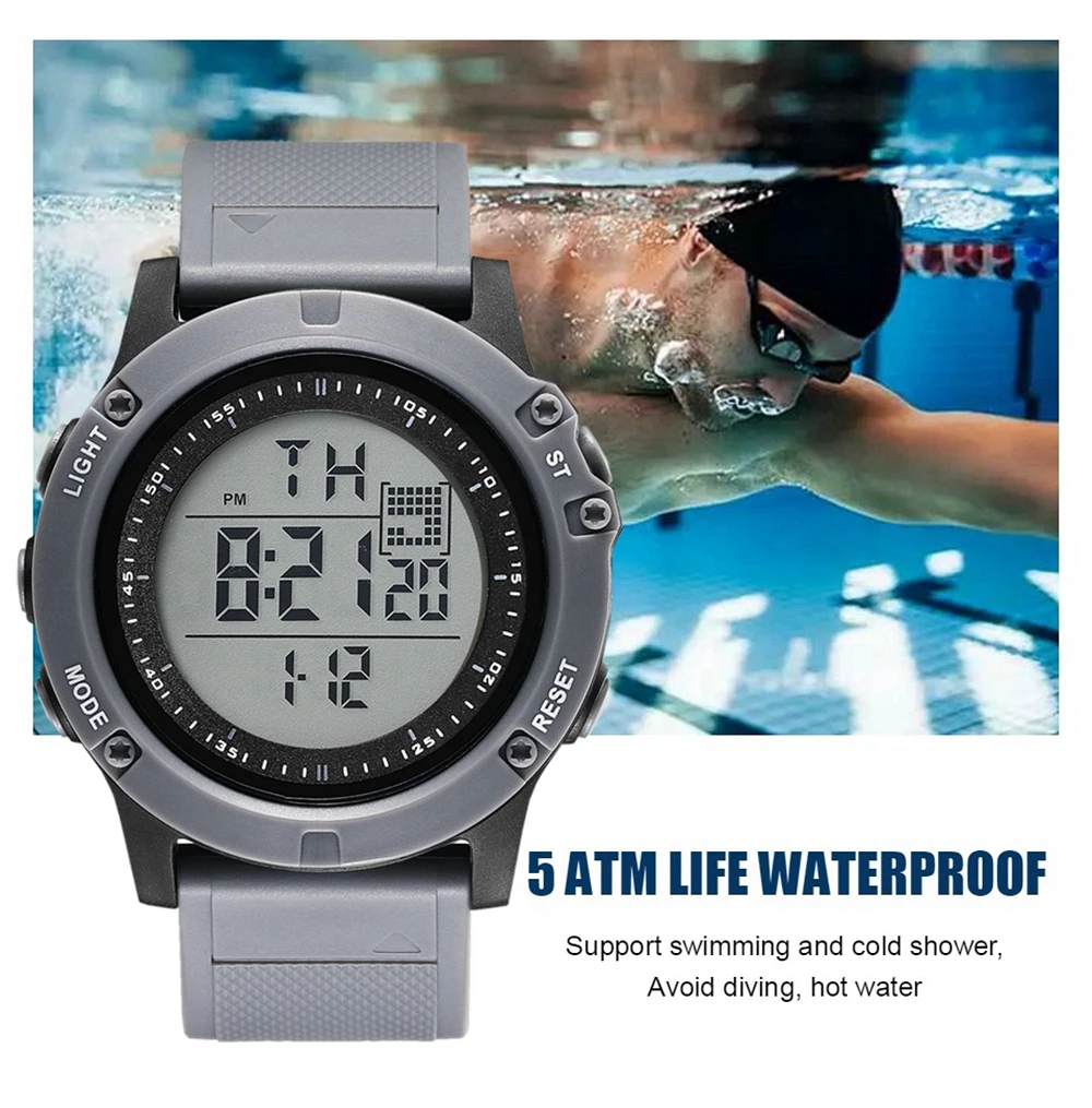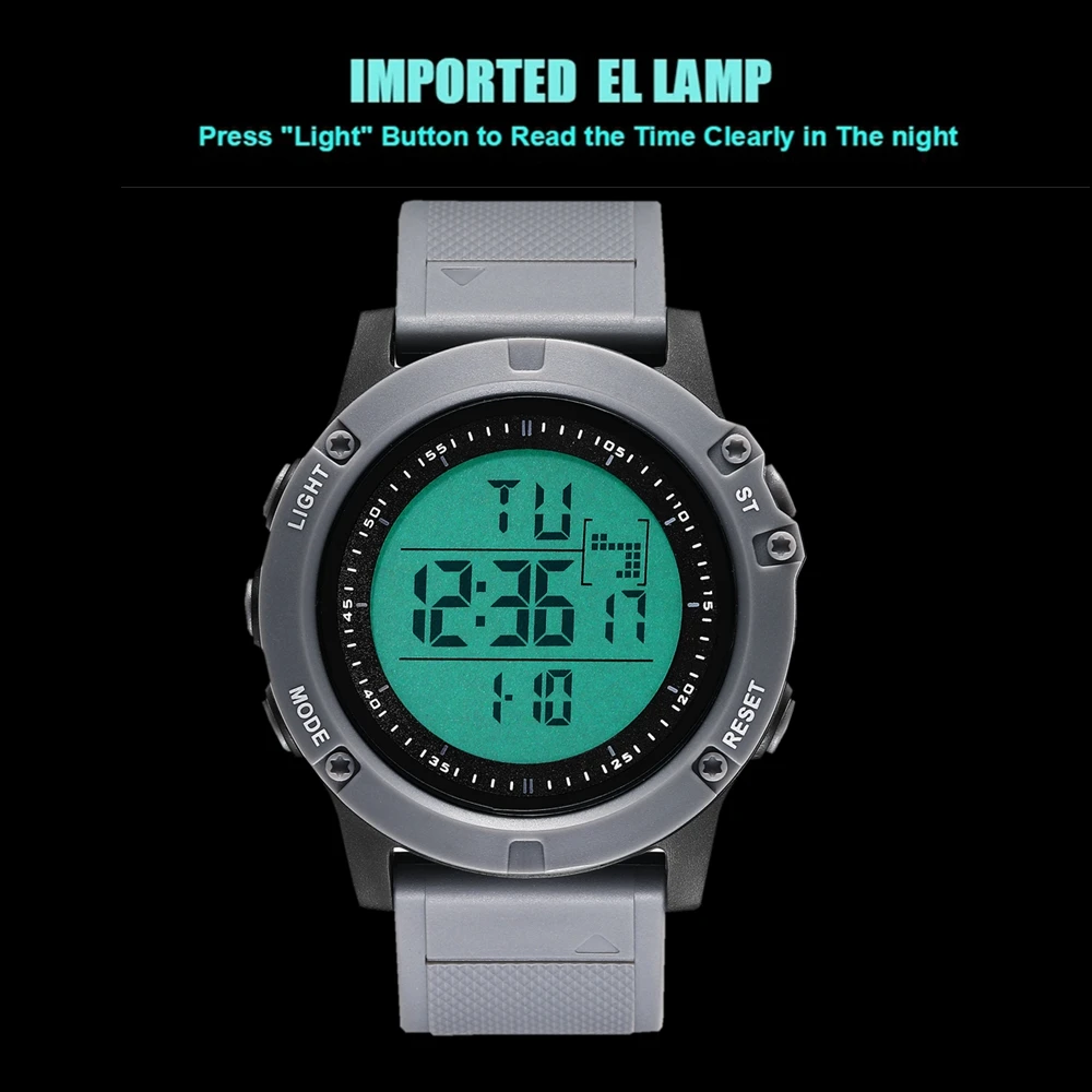 Цифровой: часы, минуты, секунды, pm, месяц, дата, день 12/24 формата отображения времени Функция будильника и ежечасного звонка Специальная конструкция с хронограф (секундомер) при температуре не выше 0,01 второй шаг На водонепроницаемость на глубине до 30 м (не нажимайте кнопки в воде) Дополнительный ЖК-светильник для четкого отображения времени в темноте Ударопрочность, подходит как для занятий спортом на улице, так и внутри спортивные