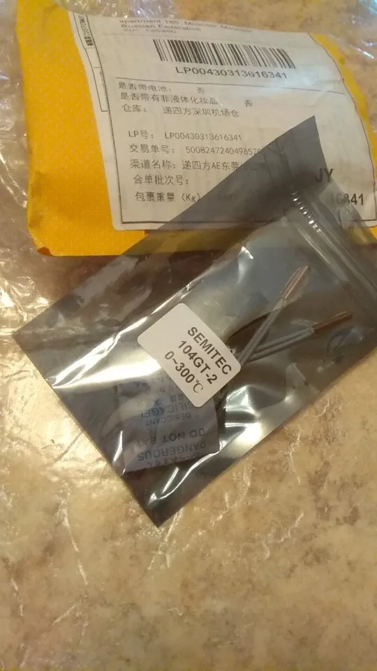 Продавец быстро отправил товар. Это Термистор, и он работает :). Я не могу видеть внутри и подтвердить, что это Semitec 104GT-2, но я надеюсь, что это продавец. Кажется хорошо сконструированным (термоклей, обжимной и т. д.). Очень хорошо Спасибо, продавец: D