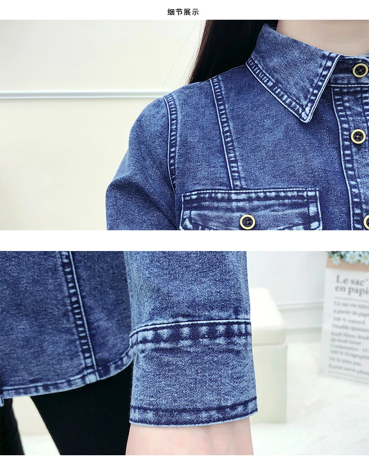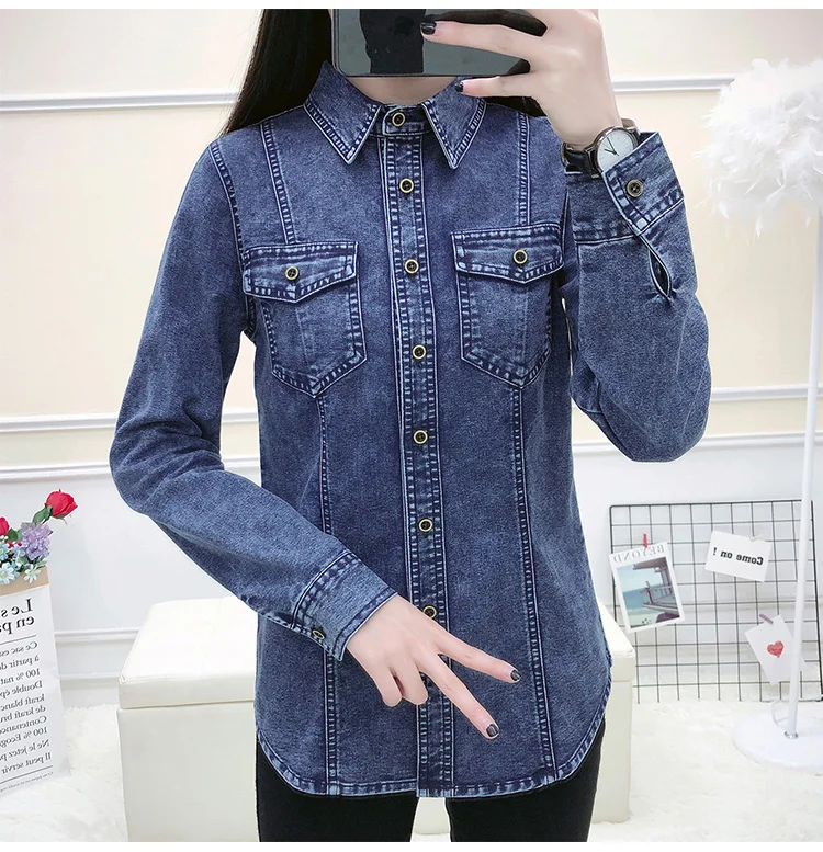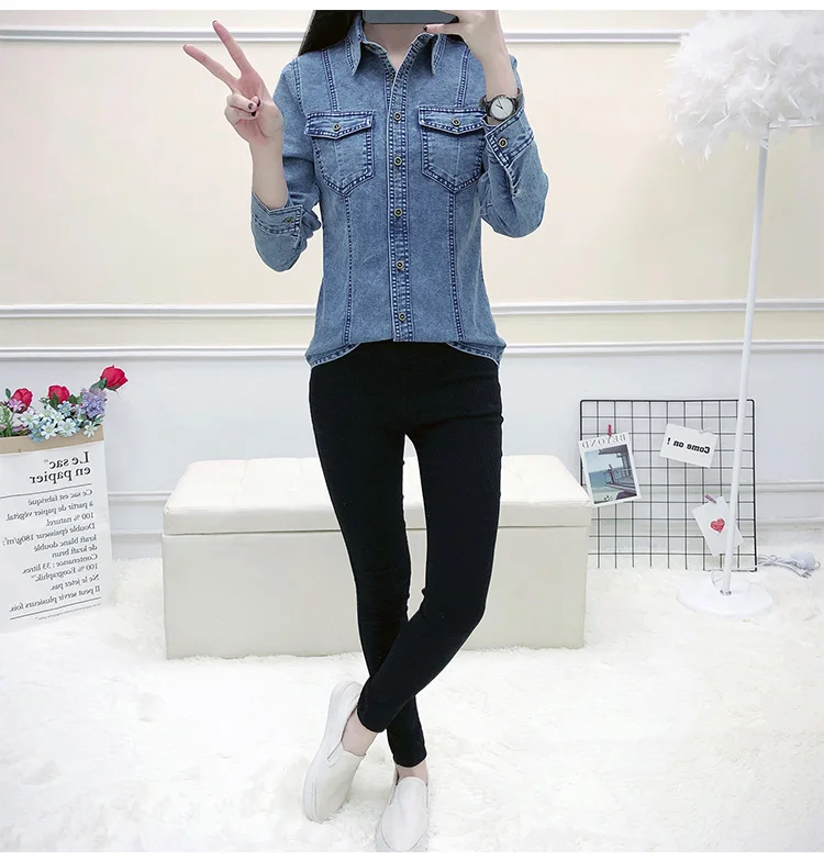 Женская Джинсовая блузка на пуговицах, голубая Повседневная блузка из хлопка с отложным воротником и длинным рукавом, с карманами, весна-осень