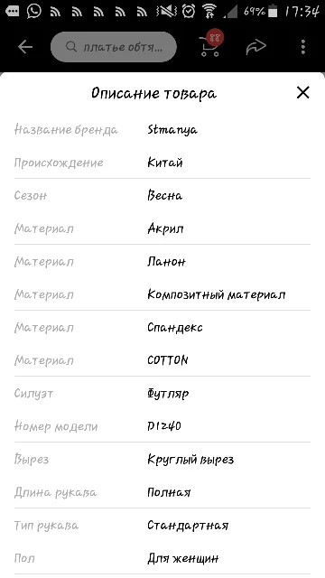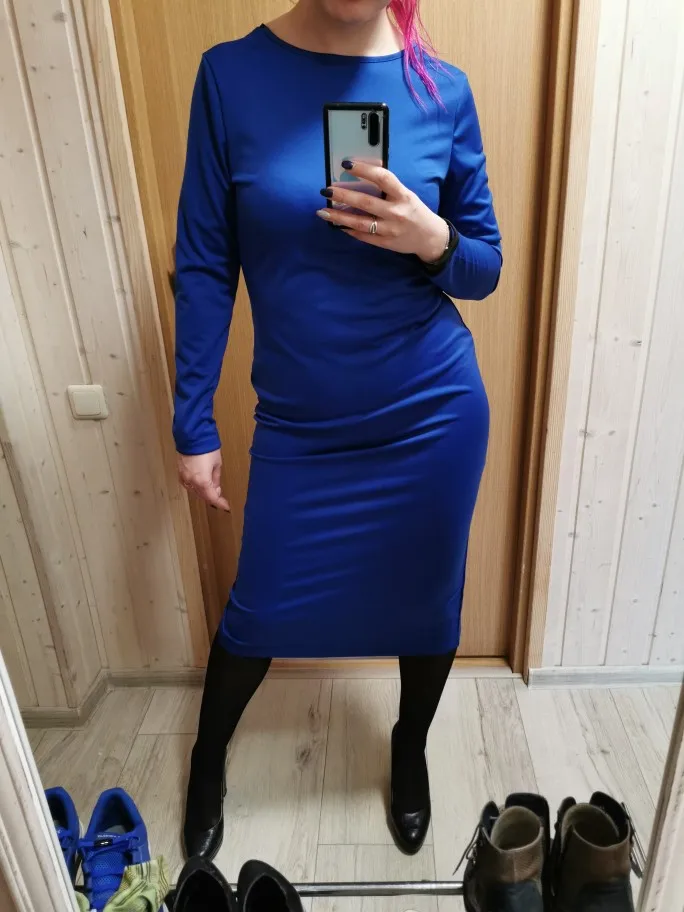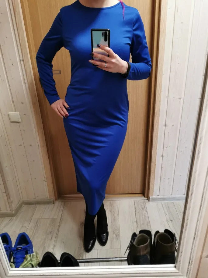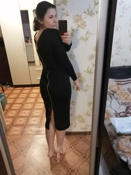Из за чёрной пятницы пришло на неделю позже . Не знаю что думать о платье .... ладно перешила в отелье все тютилька в тютельку встало , но такая ткань .... я сама худенькая но эта ткань подчеркивает не нужные изгибы и смотрится не очень , представьте на полной фигуре как подчёркнутся минусы если даже худых оно не стройнит а портит ..... сама ткань Тонкая синтетика но не прозрачная , у меня беж цвет в нем даже чёрное нижнее белье не видно ... ну ткань не удачная для такого платья была бы потолще было бы идеально а так мое мнение даже если подогнать по фигуре платье , даже если стройная ,все равно оно все выделит не красиво .... короче расстроена и думаю даже чёрный цвет и зелёный будет тупо сидеть , просто ткань не для платья . Есть такие платья за 2500 но ткань там плотная и дорогая ... брала L , ношу 44 . А ещё в отелье мне все перешивали даже замок заново пришивали так как он был волной ... бока низ отрезали , в общем полная перезагрузка платья была , оно было как мешок ....