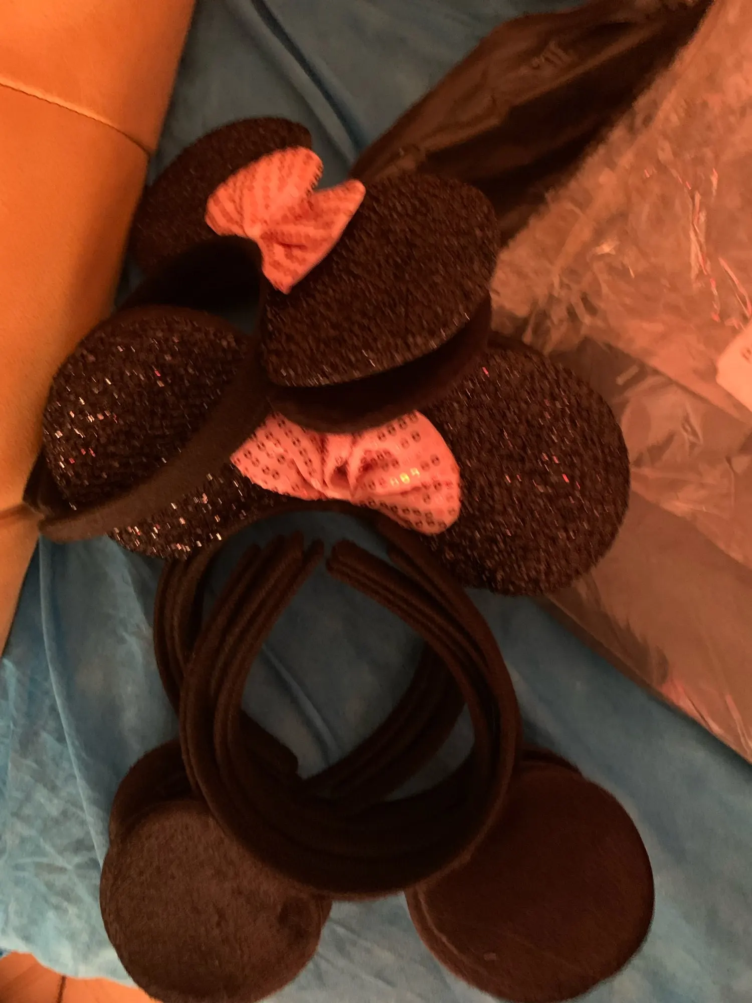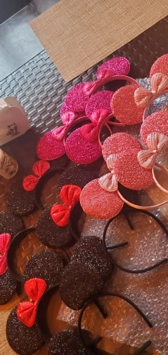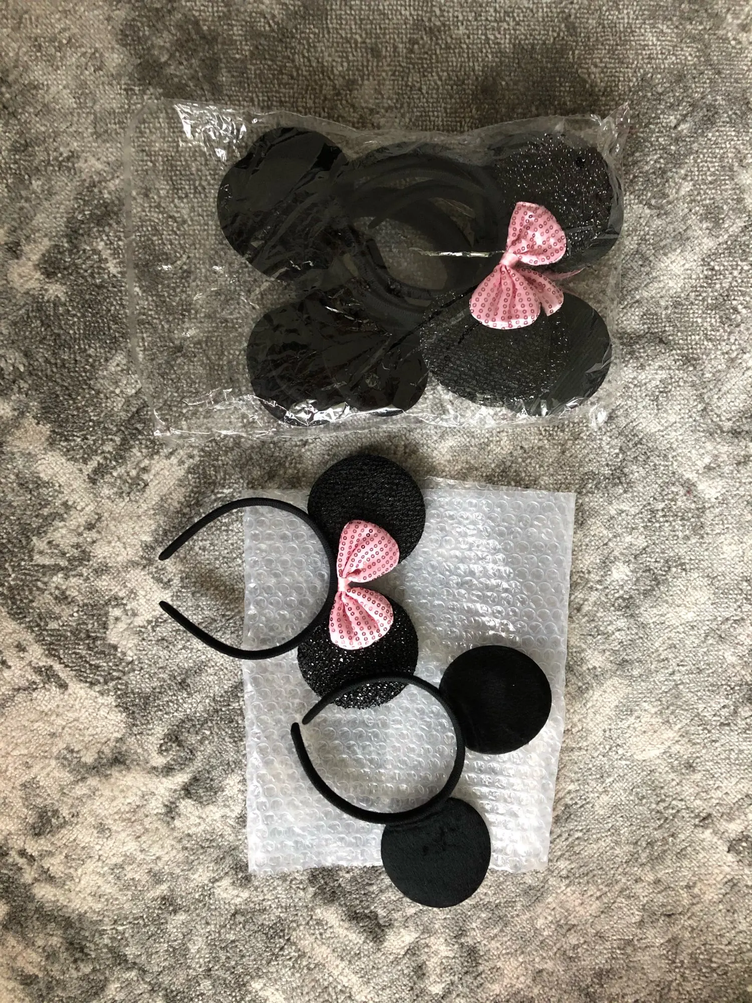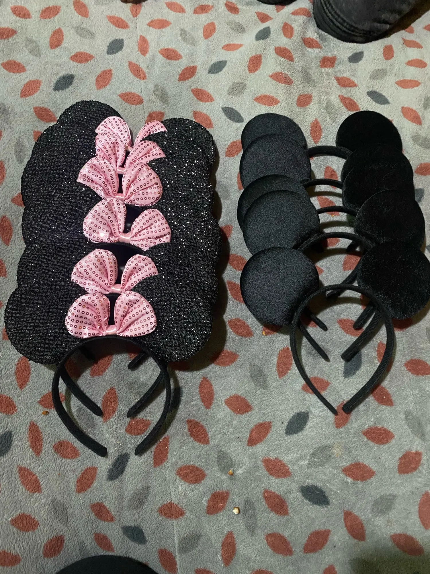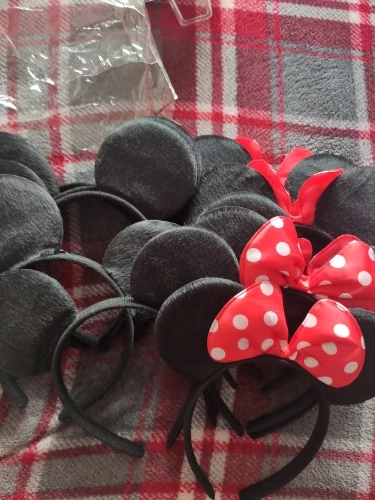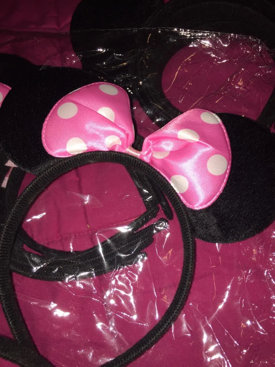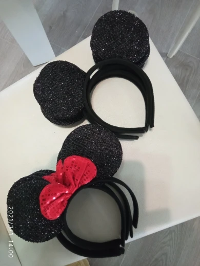 Детская алюминиевая головка с блестящими ушками мыши и блестящим бантом, как на фото. Я получил правильный цвет и количество заказанных.