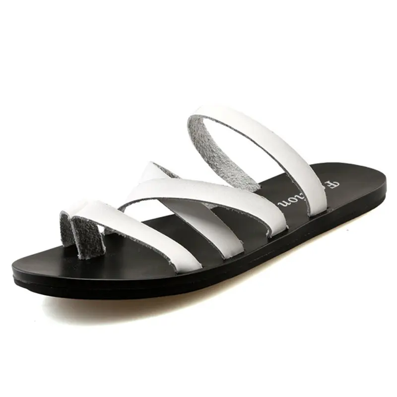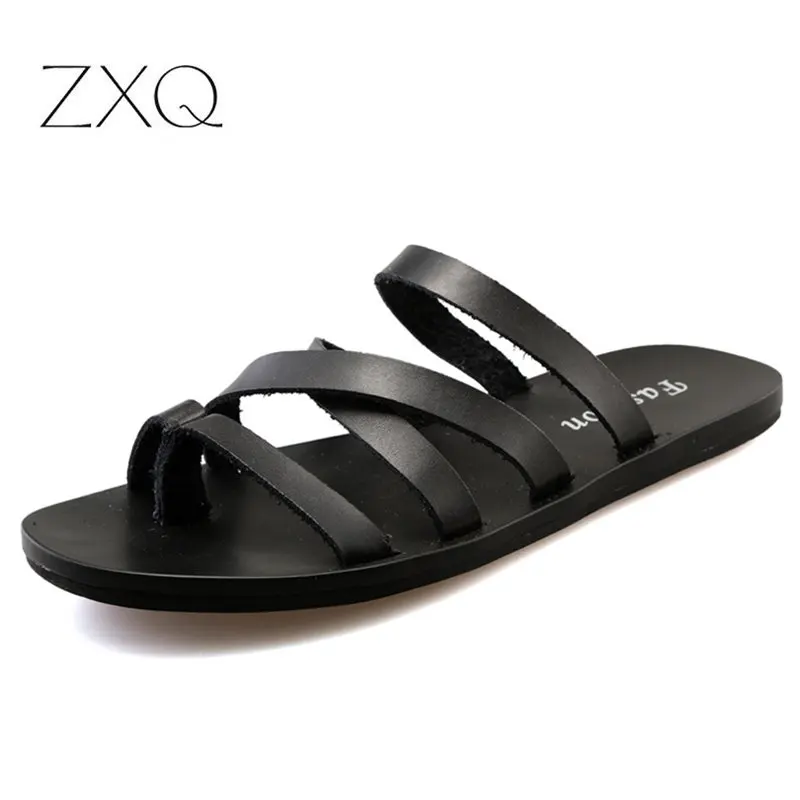 Шлепанцы мужские из натуральной кожи, сланцы для пляжа, плоская подошва, модная выразительная обувь для отдыха, Прошитые однотонные, летние