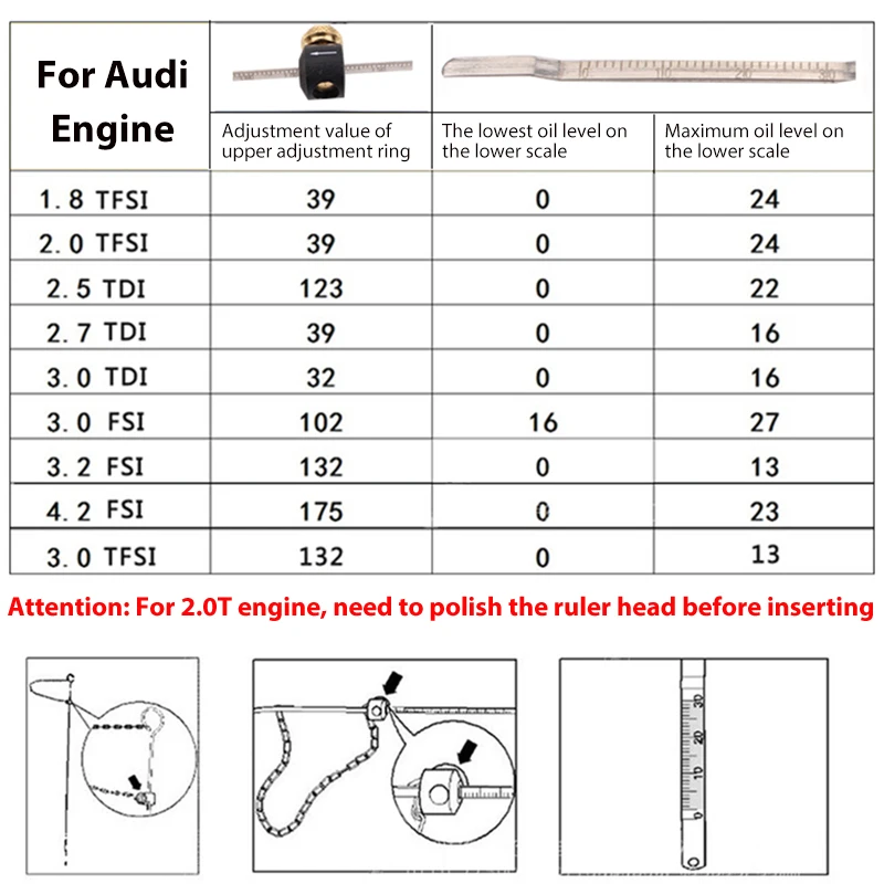1. Уровень масла не должен быть выше максимальной отметки, в противном случае каталитический преобразователь для выхлопных газов может быть поврежден.2. Для безопасности автомобиля, пожалуйста, не увеличивайте или не уменьшайте Количество заполнения масла по желанию:Dipstick T40178 подходит только для Audi, VW, Skoda и Porsche. Ничто не является всемогущим, вы видите, что мощность моторного масла разных производителей отличается, глубина отверстия для обнаружения масла также отличается. Невозможно измерить без стандартных данных, предоставленных производителем автомобиля, добавление более или менее масла непосредственно влияет на работу двигателя.