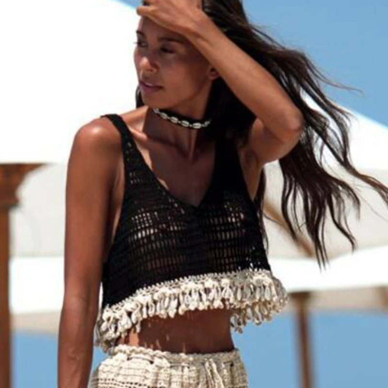 Вязаный купальник, накидки, ракушки, бикини, топы, кисточки, бахрома, пляжная одежда, открытая сеть, пляжные покрывала купальники