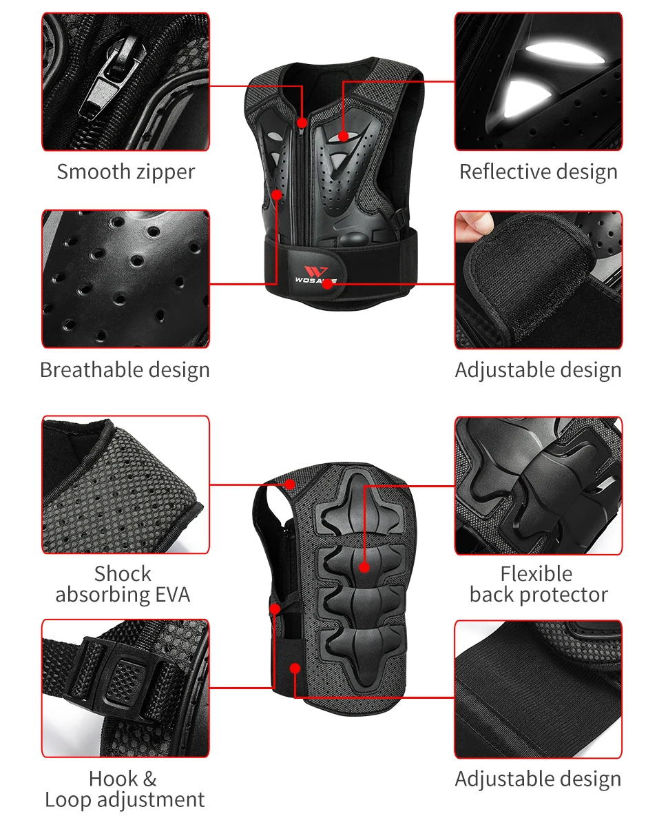 Эта бронированная куртка/жилет изготовлена из PE оболочки с пеной EVA с высокой ударопрочностью, является идеальным защитником для езды на мотоцикле, велоспорта, скейтбординга, катания на лыжах, всех видов спорта