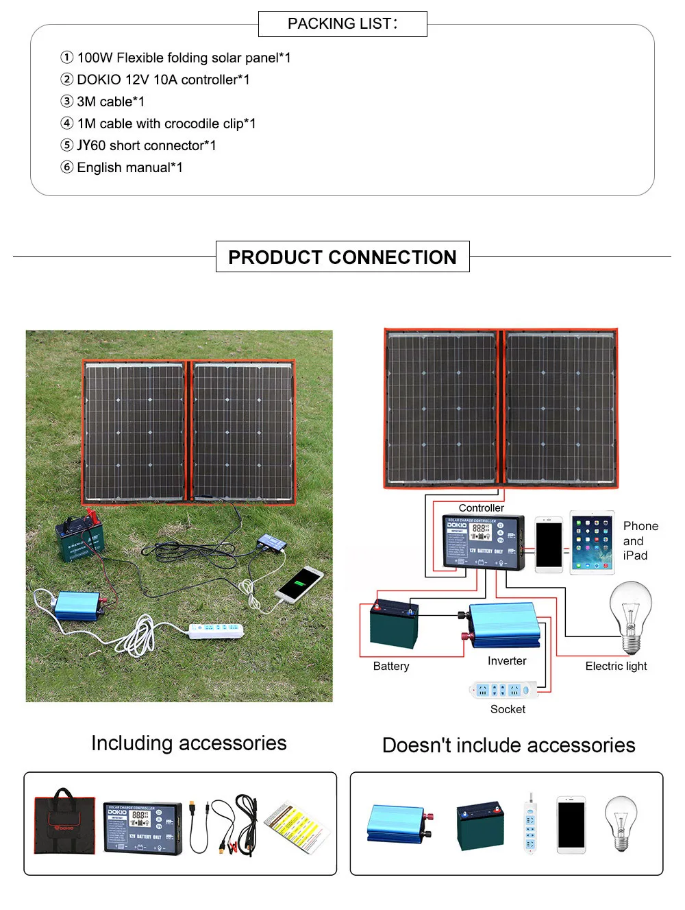 Солнечная панель Dokio, 18 в, 100 Вт, гибкая, складная, с зарядкой от usb мобильный телефон, 12 В, для кемпинга, лодки, дома