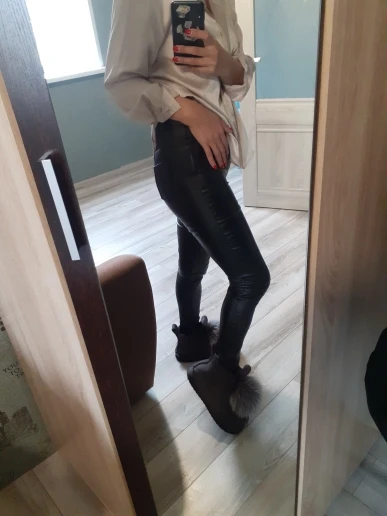 Отличные брюки! Очень быстрая доставка 11.11 заказала 25.11 получила в Ростов-на-Дону. Не кож.зам, а обработанная ткань- смотрится как кожа, тянется как надо, сидят отлично, на талии не топорщится, никакого запаха! Мой рост 156 , талия 68, бёдра 90 , размер L Взяла ( по отзывам приняла такое решение) и сел идеально! Заказывайте, будете довольны!