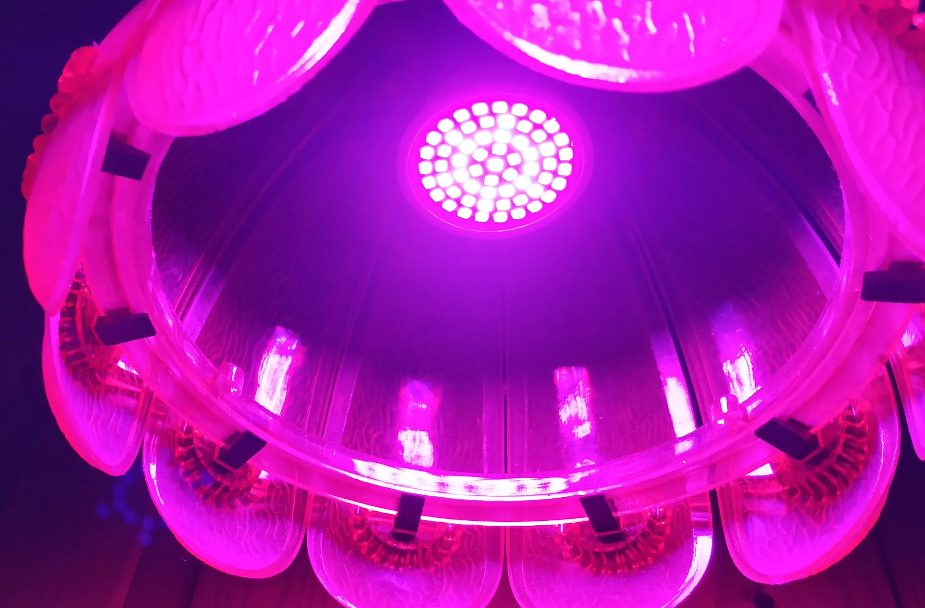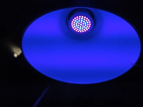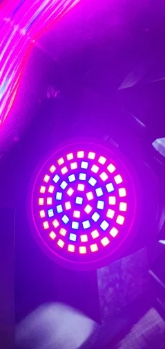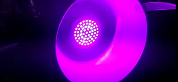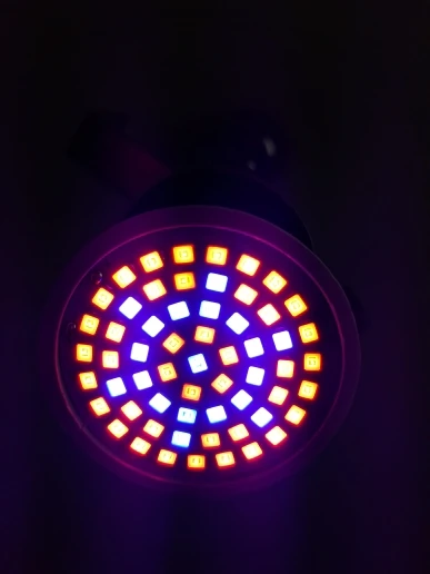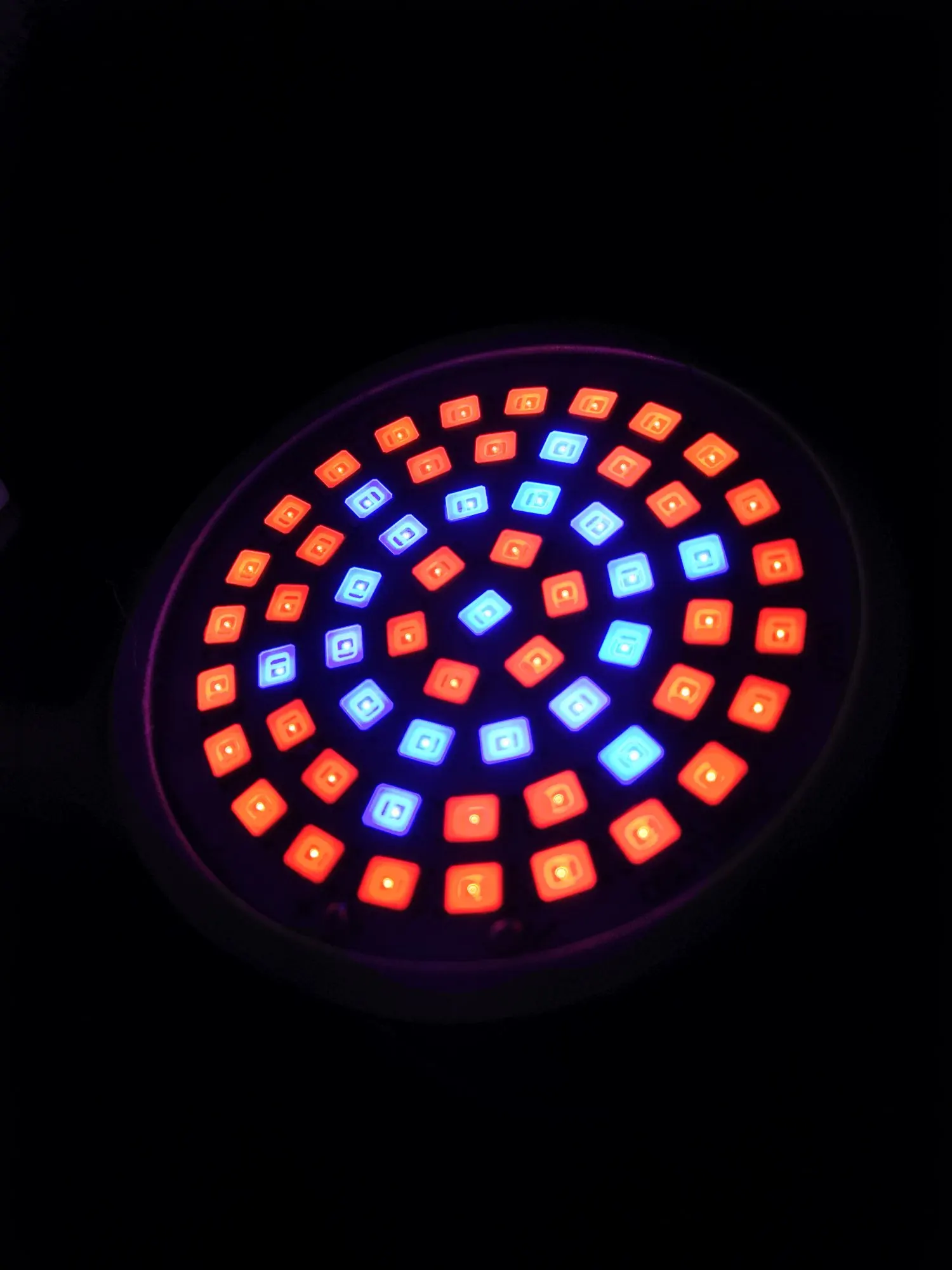 светодиоды красный и синий, в сумме фиолетовый)))) на фото это плохо видно, цвет диодов не фиксируется камерой. как оно на растения действует можно будет сказать только со временем