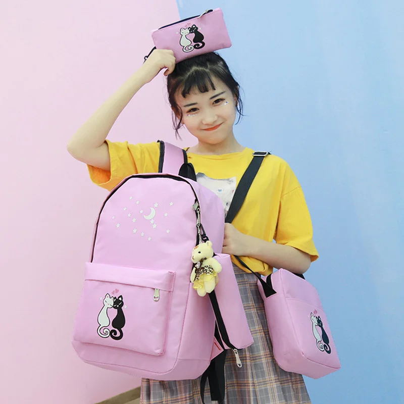 4 шт./компл., рюкзак, школьные сумки для девочек, с принтом кота, холст, детский школьный рюкзак для девочек-подростков, элегантный рюкзак, милый рюкзак