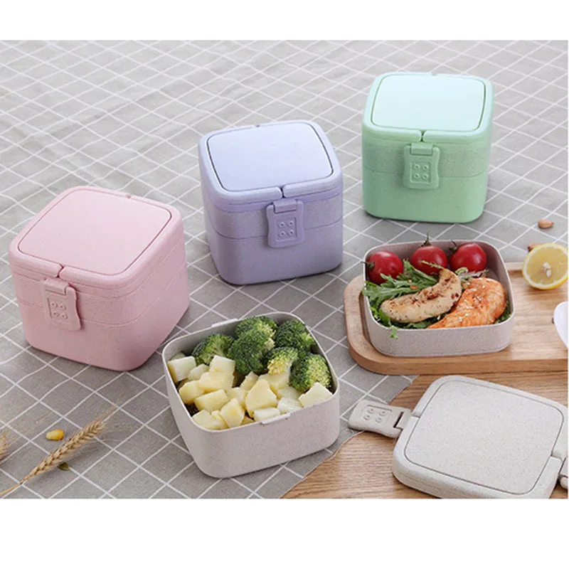 Ланч-бокс с ложкой, пшеничная солома, мультяшный двухслойный портативный контейнер для хранения продуктов Bento для детей, студентов, школы, микроволновка
