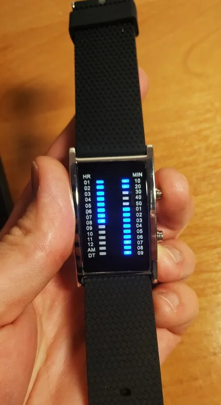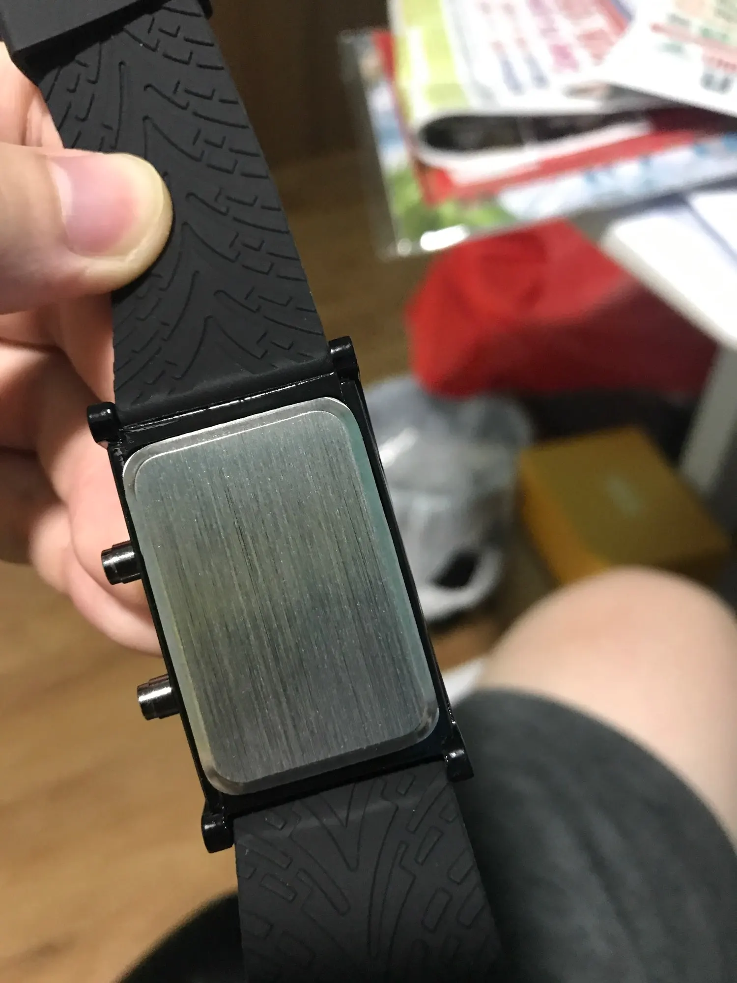 Красивые часы. Металл солидный. Ремешок толстый, резиновый. К индикации привыкнуть можно. Было бы лучше, если цифры тоже подсвечивались. Верхняя кнопка показывает время, еще раз нажмешь показывает дату. Нижняя кнопка для настройки.