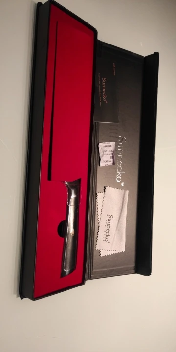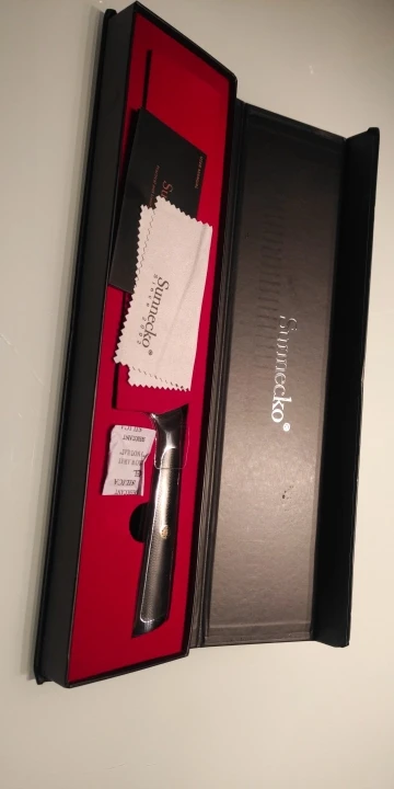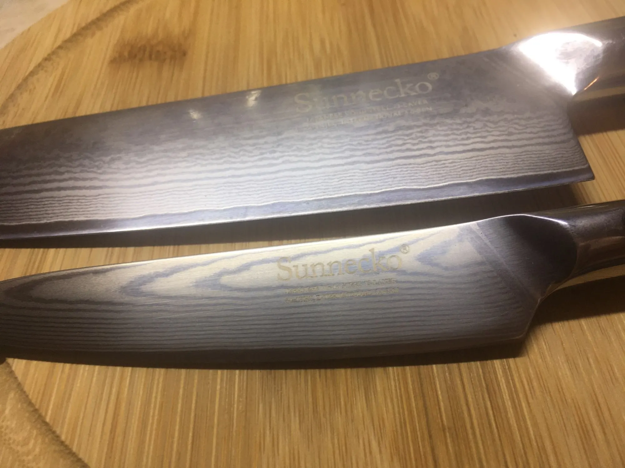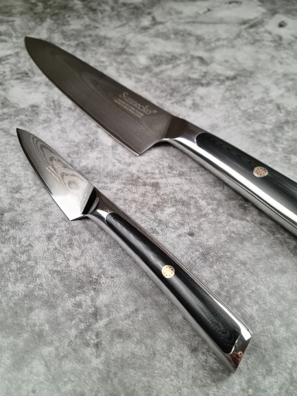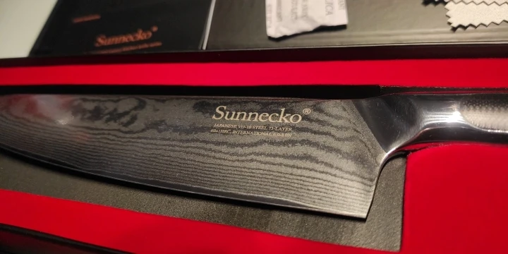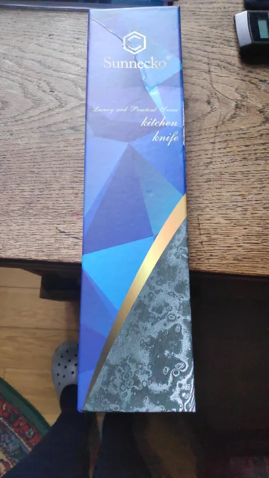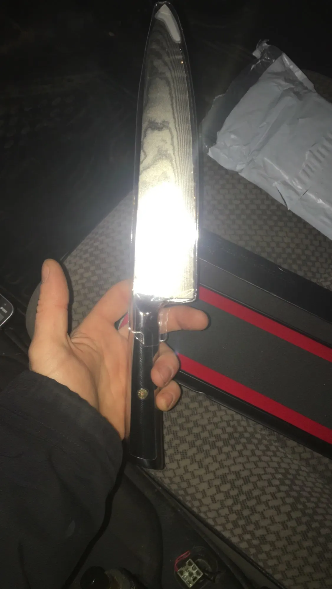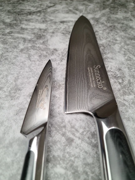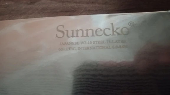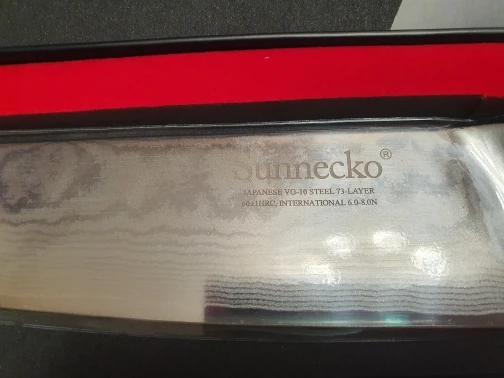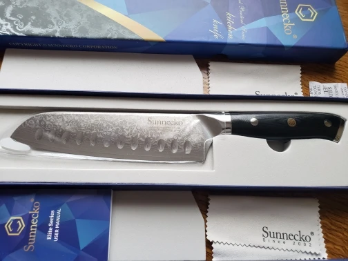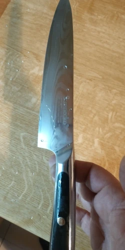 Сперва о приятном: 1. Очень быстрая доставка (в пятницу вечером заказал в понедельник утром привезли. 2. Отличная упаковка (слегка помятая, но это вопрос к доставке). Выглядит все очень стильно и дорого. Есть даже специальная тряпочка для протирки ножа. Теперь о недостатках: 1. На обоих ножах на нижней части рукоятки (полированной) видны какие-то вкрапления (есть на фото), мелочь , но очень портит впечатление , начинаешь присматриваться внимательнее. 2. Есть стойкое ощущение , что фактуру Дамасской стали имитирует пленка . Рукоятка и лезвие сделаны из одинакового материала. На лезвии фактура есть а на рукоятке нет :-) . Вывод: своих денег наверное стоит (время покажет , как долго держит заточку). Скорее всего это обычный кухонный нож с имитацией под дорогой профессиональный .