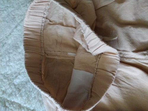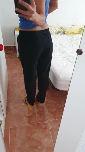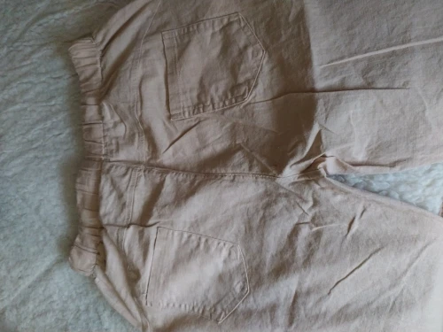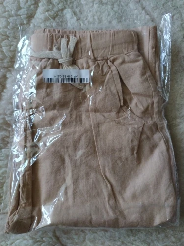 Посылка шла до Москвы более месяца, продавец не сразу отправил. Брючки легкие на лето, брала цвет бежевый, оказался более темнее, чем на рисунке. Также непонятно с размером, заказывала М, пришли с отрезанной биркой, поэтому размер остался неизвестен, но на мои параметры 90×73×95 и рост 165 подошли. Сами брюки по щиколотки, пояс на резинке, спереди карманы, сзади также карманы, строчки прошиты нормально.
