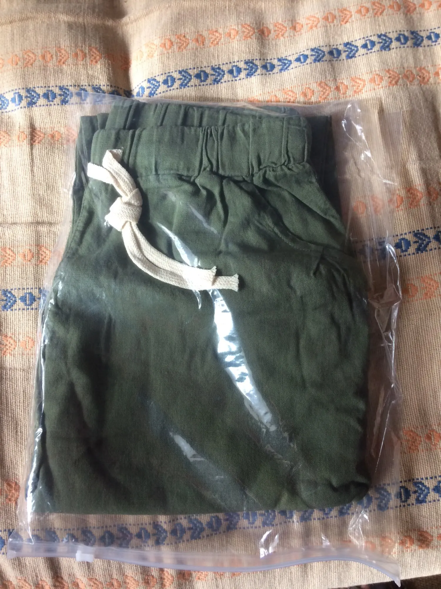 Товар пришёл быстро. По размеру подошёл, но по качеству не понравилось. Фиксируется простой белой веревкой, цвет брюк болотный. Не знаю как будут носится. Вообщем не понравились. С продавцом не общалась.