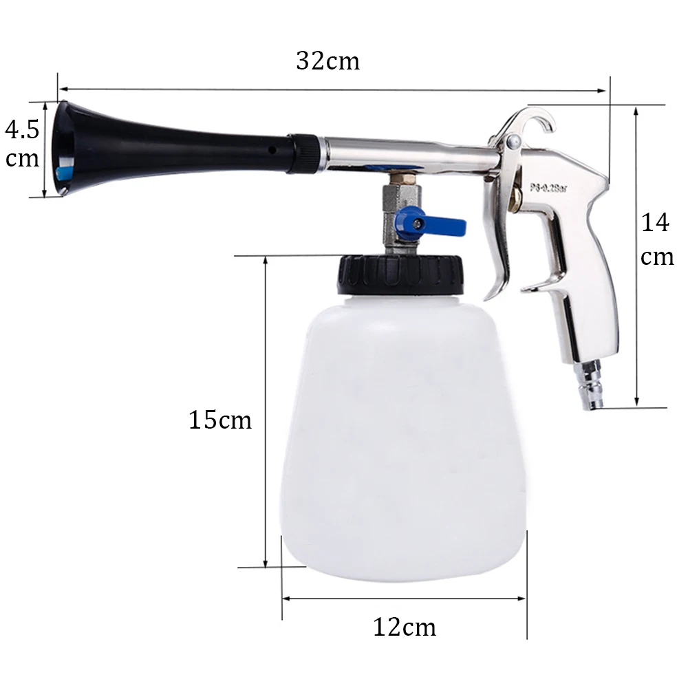 Характеристики:• Состояние на 100% абсолютно новый и высокое качество• Тип изделия: мойка высокого давления• Материал корпуса: сплав• Материал разъема: сплав• Материал поршня: сплав• Рабочее давление: 8 (МПа)• Давление: 6-9,2 кг бар• Рабочая температура: 10-40 °• Длина инструмента: 320 мм• Емкость: 1000 мл• Разъем: Европейский разъем/Американский разъем/японский разъемОсобенности:• Технология вращения внутри конуса может быстро и эффективно очищать поверхность.• Небольшой воздушный компрессор производит огромную мощность, увеличивает скорость очистки.• Ручка из сплава, тонкая и прочная, не ржавеет.• Большая емкость, используется для очистки автомобилей, машин и оборудования, стен и так далее.•Подходит для чистки автомобильной обивки, шерсти, кожаной обивки автомобиля,Приборная панель, руль, дверные панели, ковер, коврики, крыша автомобиля,Поверхность двигателя, поверхность шины, поверхность колеса.Посылка:1x чистящие пистолеты1 щеткаПримечание:Светильник щение и различные дисплеи могут вызвать цвет изделияНа картинке немного отличается от реального. ИзмерениеДопустимая погрешность +/- 1-3 см.