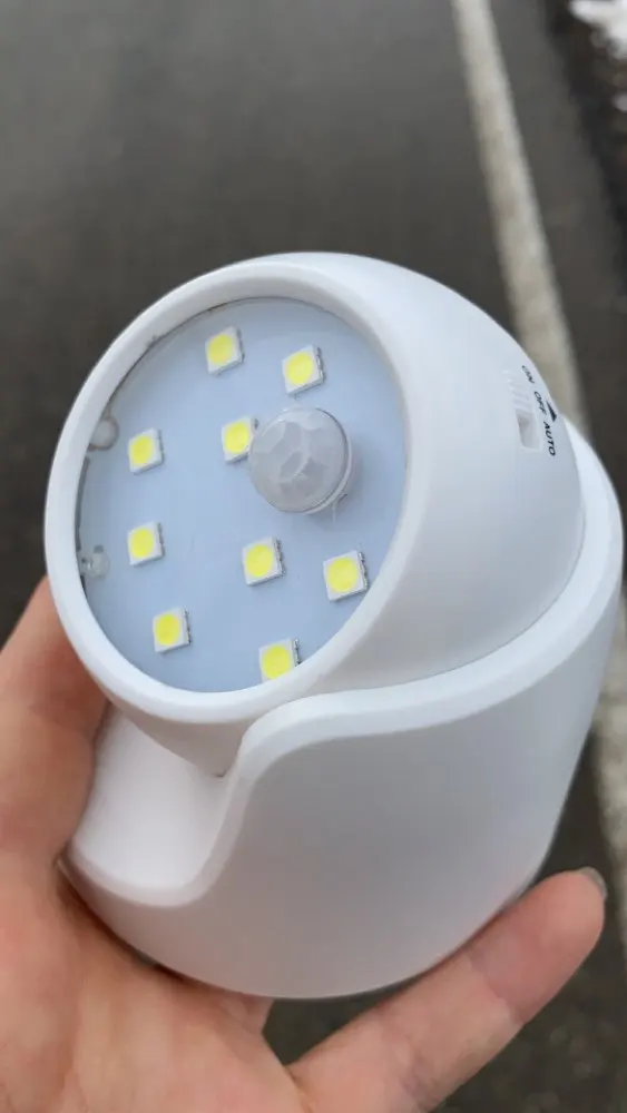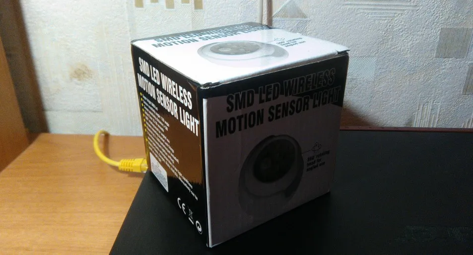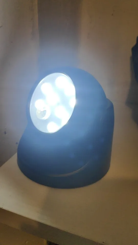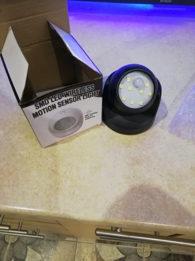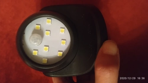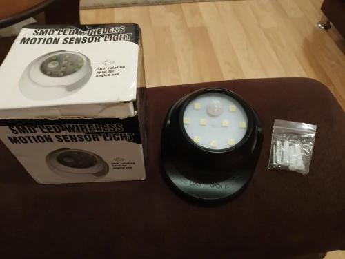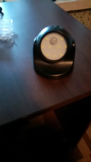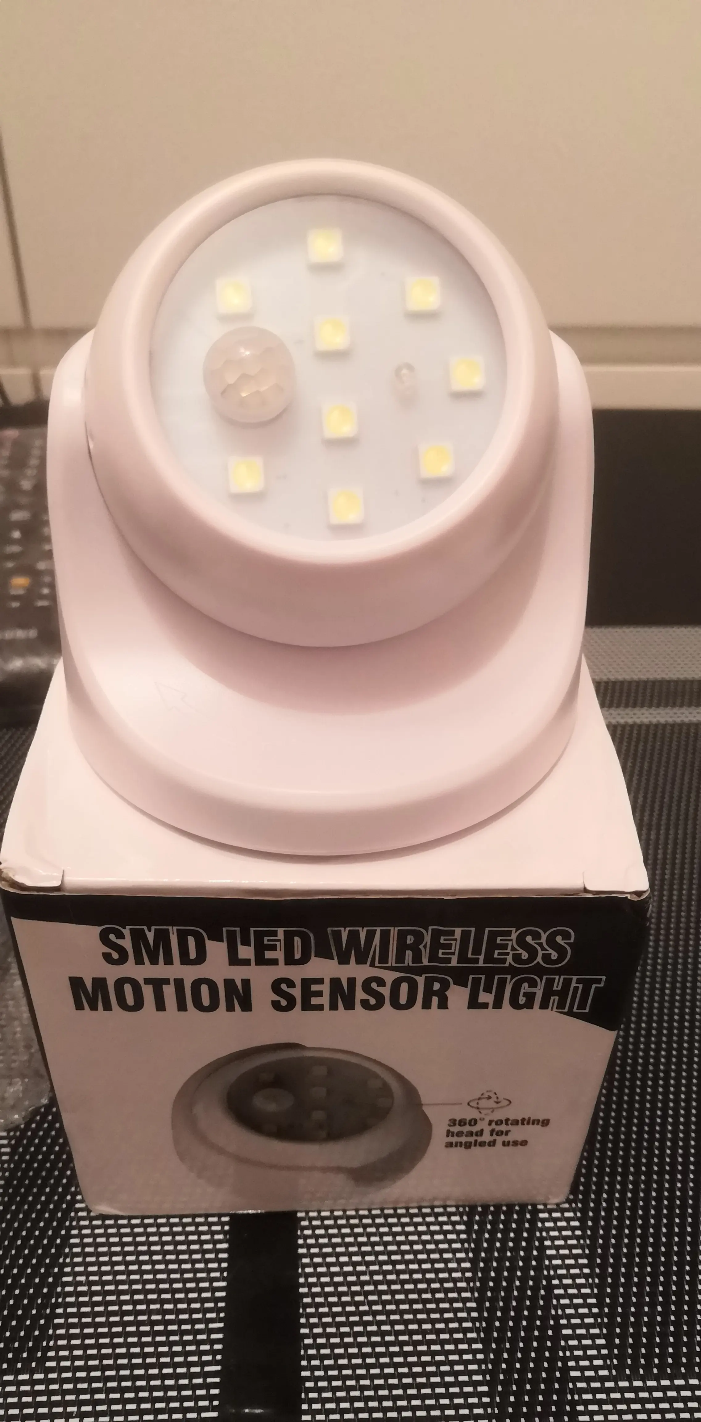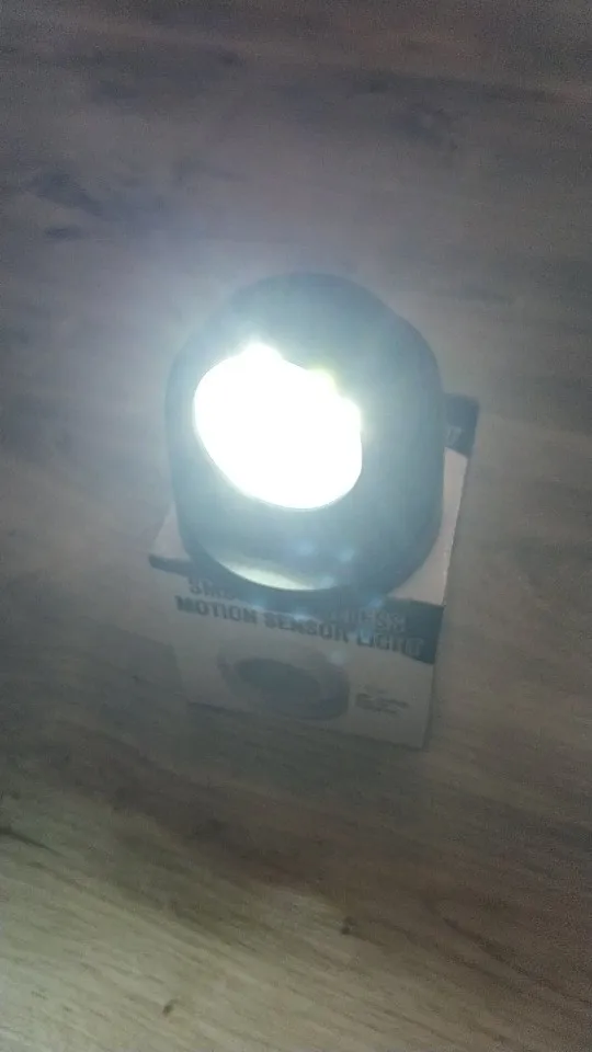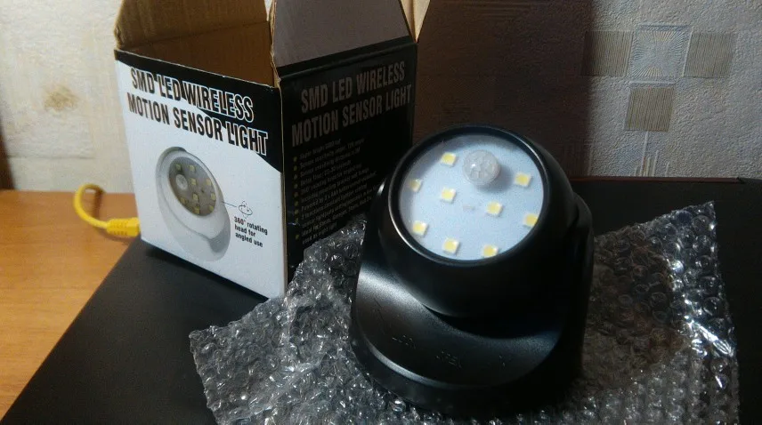 Всё работает, датчик движения реагирует в радиусе 3х метров. Включается от батареек