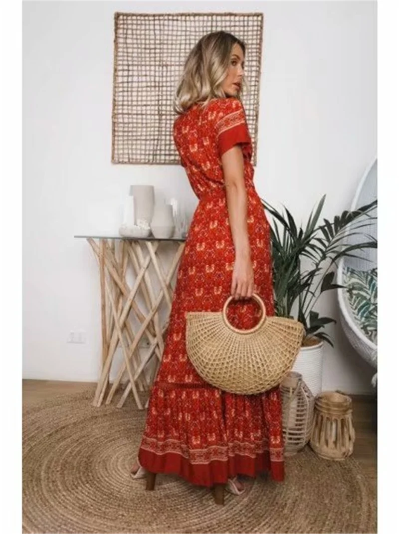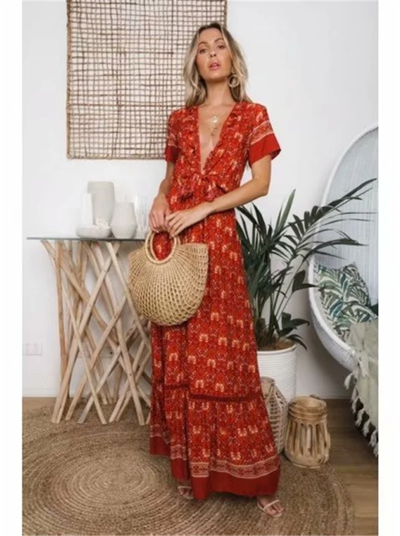 Женское богемное Платье макси с коротким рукавом и V-образным вырезом