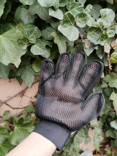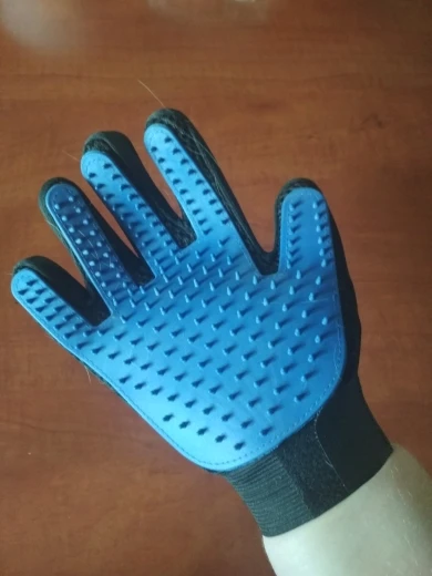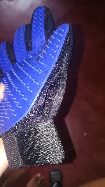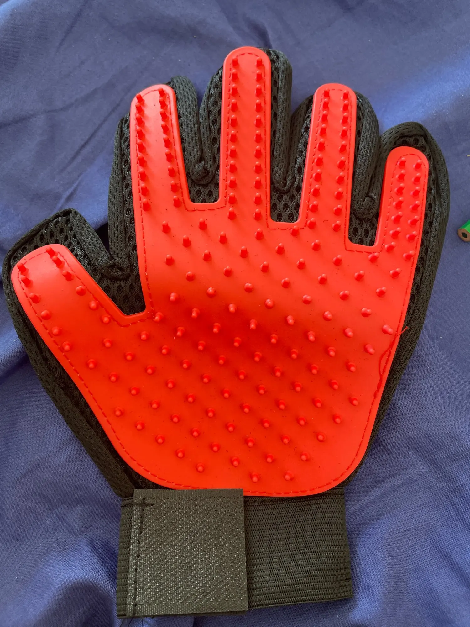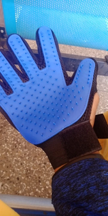 Перчатка сделала из хорошего материала, на руку надевается легко, для комфортности фиксируется липкой лентой на запястье. Шерсть как следует не вычёсывает, скорее как массажная перчатка. Хорошая альтернатива для жёстких щёток , можно вычёсывать мертвые волоски хоть каждый день.