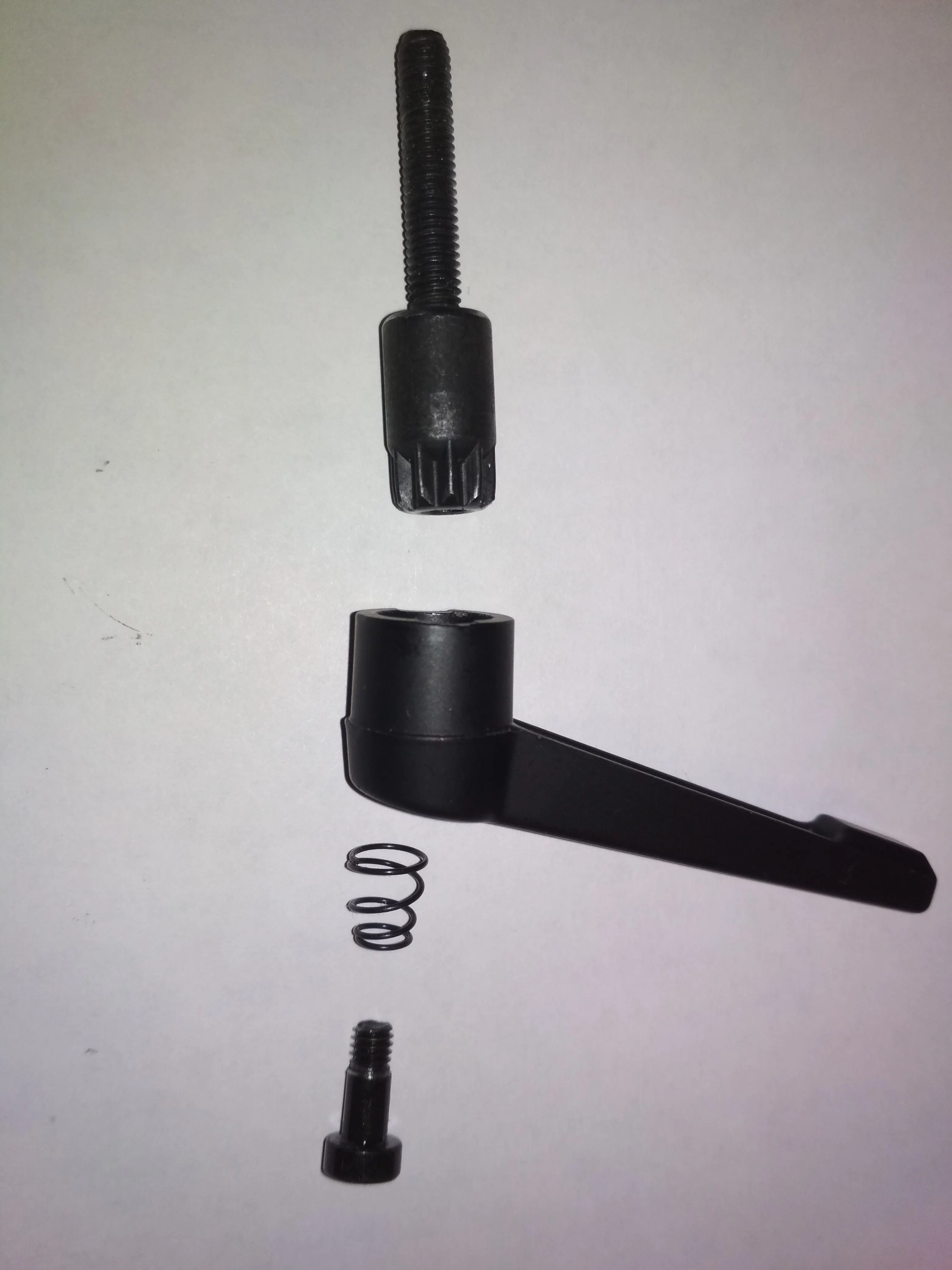 Хорошая ручка. Рукоятка - сплав, похоже алюминиевый. Детали внутри - железные. Ручка оттягивается на себя (в сторону от винта) и может переставляться на другой угол. Затем возвращается назад и снова можно закручивать или откручивать. Механика в разобранном виде - на третьей фотографии. В общем - ручка понравилась, заказал еще - на другую резьбу.
