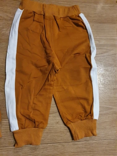 Костюм понравился, смотрится отлично. Кое-где торчат нитки, но это легко исправимо. Ткань не плотная, приятная на ощупь, мягкая. Есть бирки. Состав ткани указан "хлопок и др.". На брюках есть карманы по бокам и один сзади. На ребёнка 105 см костюм сел с небольшим запасом. Спасибо большое продавцу за прекрасный товар и отличный сервис!