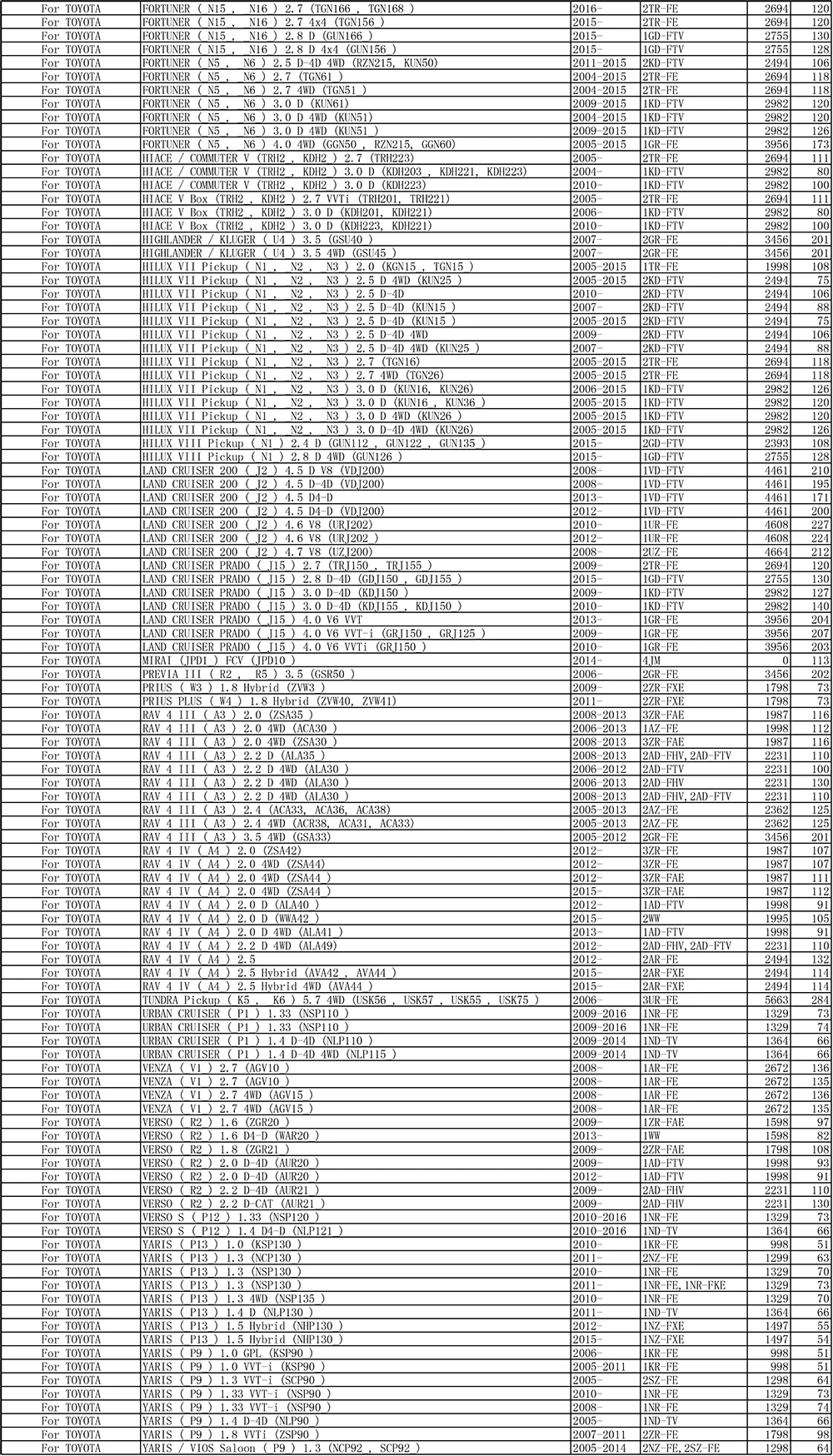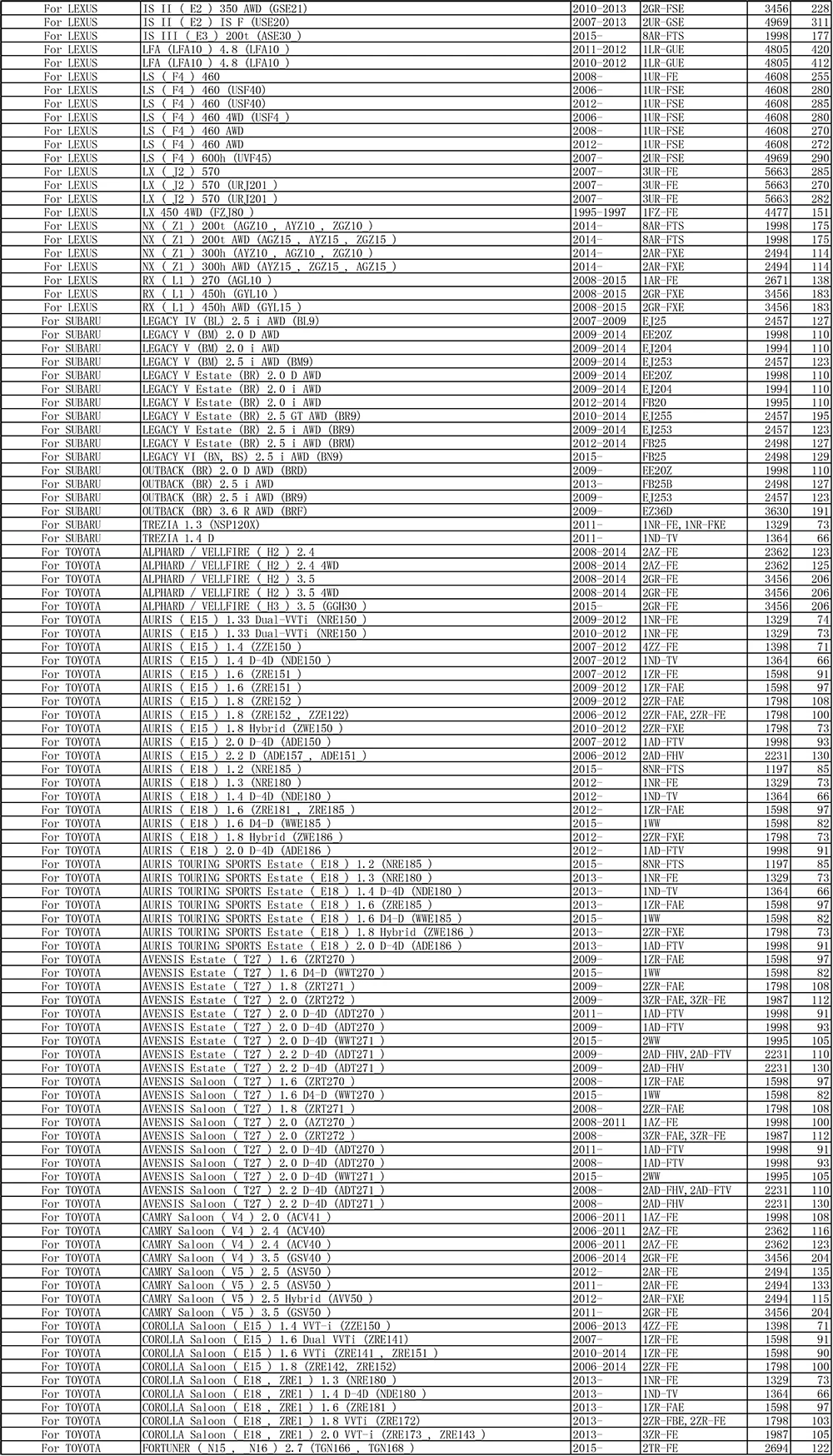 Приспособление: Для Land Rover Range Rover V6 3,0 [2014-2016] Для Land Rover Range Rover V8 5,0 [2014-2016] Для Lexus CT200h L4 1,8 [2011-2017] Для Lexus ES300h L4 2,5 [2013-2018] Для Lexus ES350 V6 3,5 [2007-2018] Для Lexus GS300 V6 3,0 [2006-2006] Для Lexus GS350 V6 3,5 [2007-2011] Для Lexus GS430 V8 4,3 [2006-2007] Для Lexus GS450h V6 3,5 [2007-2011] Для Lexus GS460 V8 4,6 [2008-2011] Для Lexus GX460 V8 4,6 [2010-2018] Для Lexus HS250h L4 2,4 [2010-2012] Для Lexus IS F V8 5,0 [2008-2014] Для Lexus IS250 V6 2,5 [2006-2013] Для Lexus IS250C V6 2,5 [2010-2014] Для Lexus IS350 V6 3,5 [2006-2013] Для Lexus IS350C V6 3,5 [2010-2015] Для Lexus LFA V10 4,8 [2012-2012] Для Lexus LS460 V8 4,6 [2007-2017] Для Lexus LS460L V8 4,6 [2007-2013] Для Lexus LS600h V8 5,0 [2008-2015] Для Lexus LX570 V8 5,7 [2008-2017] Для Lexus NX200t L4 2,0 [2015-2016] Для Lexus NX300h L4 2,5 [2015-2016] Для Lexus RX350 V6 3,5 [2010-2015] Для Lexus RX450h V6 3,5 [2010-2015] Для Pontiac Vibe L4 1,8 [2009-2010] Для Pontiac Vibe L4 2,4 [2009-2010] Для Scion iM L4 1,8 [2016-2016] Для Scion tC L4 2,5 [2011-2016] Для Scion xB L4 2,4 [2008-2015] Для Scion xD L4 1,8 [2008-2014] Для Subaru Legacy H4 2,5 [2010-2018] Для Subaru Legacy H6 3,6 [2010-2018] Для Subaru Outback H4 2,5 [2010-2018] Для Subaru Outback H6 3,6 [2010-2018] Для Toyota 4runner L4 2,7 [2010-2010] Для Toyota 4runner V6 4,0 [2010-2018] Для Toyota Avalon Hybrid L4 2,5 [2013-2017] Для Toyota Avalon V6 3,5 [2005-2017] Для Toyota Camry L4 2,4 [2007-2009] Для Toyota Camry Hybrid L4 2,4 [2007-2011] Для Toyota Camry L4 2,5 [2010-2017] Для Toyota Camry Hybrid L4 2,5 [2012-2017] Для Toyota Camry V6 3,5 [2007-2017] Для Toyota Corolla L4 1,8 [2009-2018] Для Toyota Corolla L4 2,4 [2009-2012] Для Toyota Corolla iM L4 1,8 [2017-2017] Для Toyota Highlander L4 2,7 [2009-2017] Для Toyota Highlander Hybrid V6 3,3 [2008-2010] Для Toyota Highlander V6 3,5 [2008-2018] Для Toyota Highlander Hybrid V6 3,5 [2011-2018] Для Toyota Land Cruiser V8 5,7 [2008-2018] Для Toyota Matrix L4 1,8 [2009-2014] Для Toyota Matrix L4 2,4 [2009-2013] Для Toyota Prius L4 1,8 [2010-2018] Для Toyota Prius C L4 1,5 [2012-2018] Для Toyota Prius Plug-In L4 1,8 [2012-2015] Для Toyota Prius V L4 1,8 [2012-2015] Для Toyota RAV4 L4 2,4 [2006-2008] Для Toyota RAV4 L4 2,5 [2009-2018] Для Toyota RAV4 Hybrid L4 2,5 [2016-2018] Для Toyota RAV4 V6 3,5 [2006-2012] Для Toyota Sequoia V8 4,6 [2010-2012] Для Toyota Sequoia V8 4,7 [2008-2009] Для Toyota Sequoia V8 5,7 [2008-2018] Для Toyota Sienna L4 2,7 [2011-2013] Для Toyota Sienna V6 3,5 [2011-2017] Для Toyota Tundra V6 4,0 [2007-2014] Для Toyota Tundra V8 4,6 [2010-2018] Для Toyota Tundra V8 4,7 [2007-2009] Для Toyota Tundra V8 5,7 [2007-2017] Для Toyota Venza L4 2,7 [2009-2016] Для Toyota Venza V6 3,5 [2009-2016] Для Toyota Yaris L4 1,5 [2006-2016]