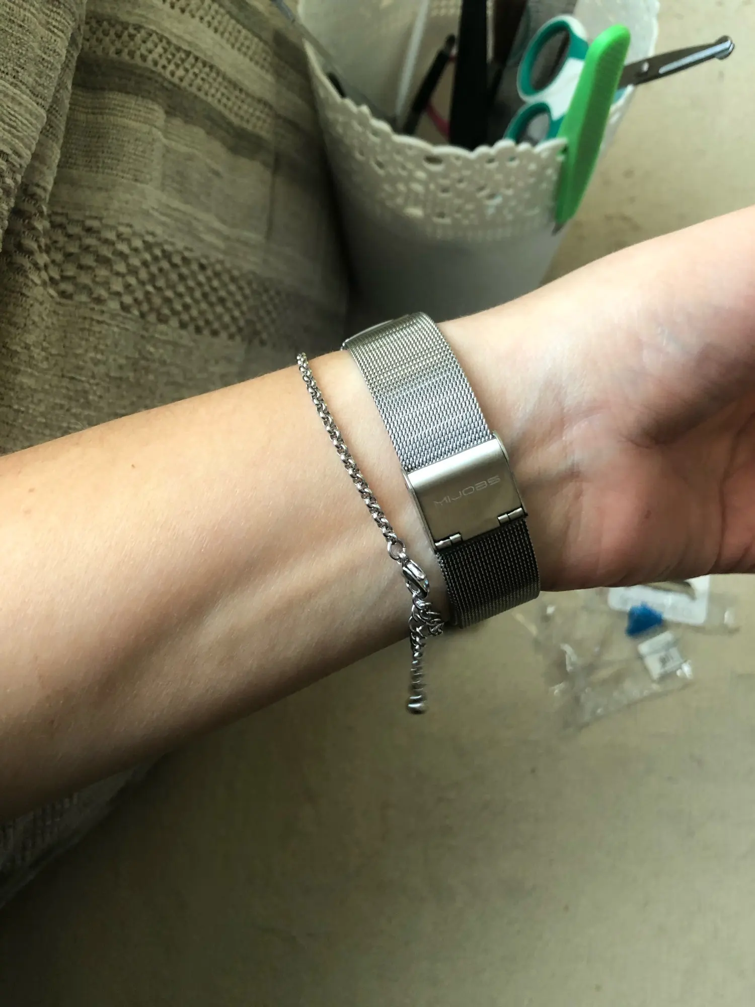 Он не выглядит так, как показано на изображении продукта. Они имеют различные стили. Тот, который я заказал, должен иметь около 10 цепных звеньев в линии, но тот, который я получил, намного плотнее-он имеет около 20 звеньев, и звенья расположены по-разному. Если вы довольны какой-либо черной металлической лентой, это нормально. Другие люди оценивают здесь, кажется, не заметят и не возражают.