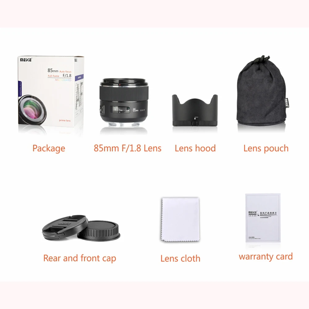 Посылка входит: 1x85 мм объектив 1 x чехол для объектива 1 x ткань для чистки Meike 1 x бленда объектива 1 задняя и передняя крышки 1 гарантийный талон