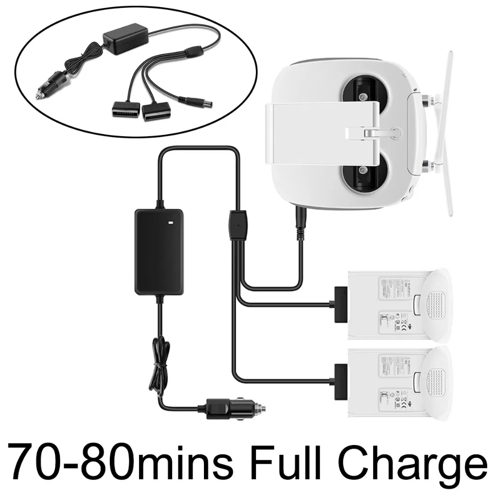3 в 1 Автомобильное зарядное устройство, специально разработанное для аккумуляторов и передатчиков дрона DJI Phantom 4 серии RC, используется для зарядки интеллектуального летного аккумулятора Phantom 4 и дистанционного управления через порт автомобильного прикуривателя, можно заряжать 2 батареи и пульт дистанционного управления одновременно.
