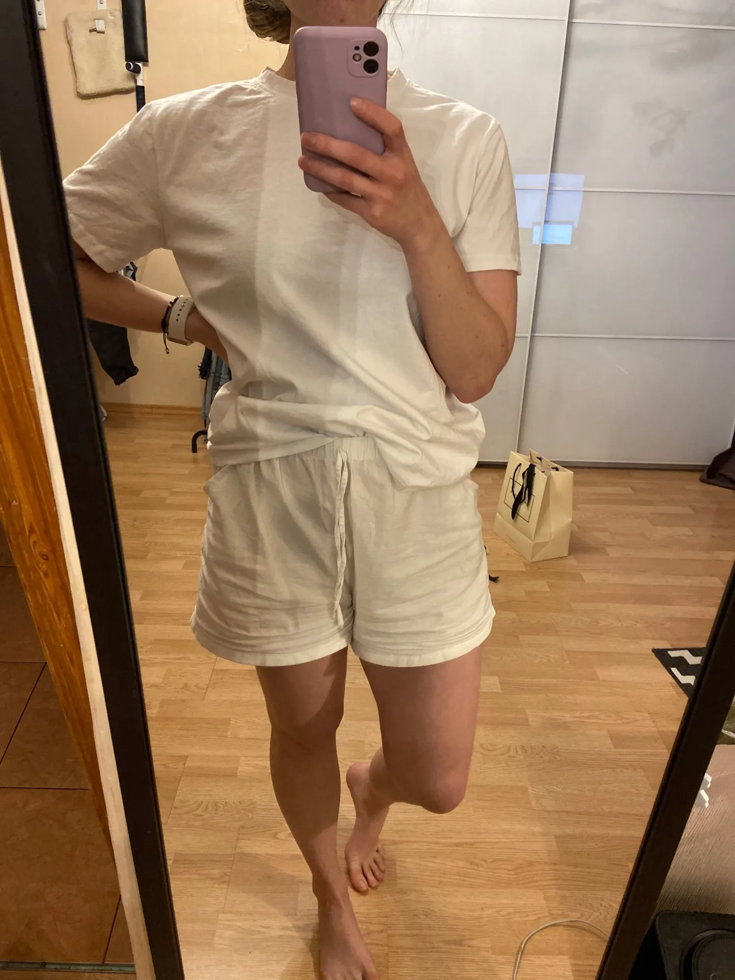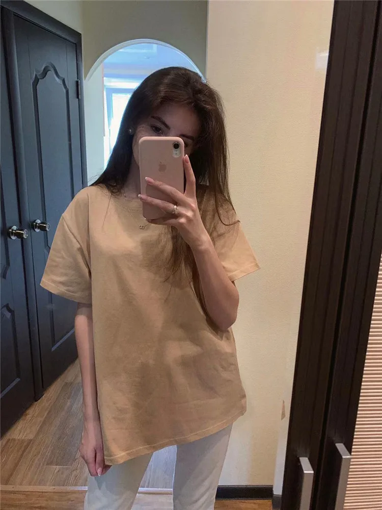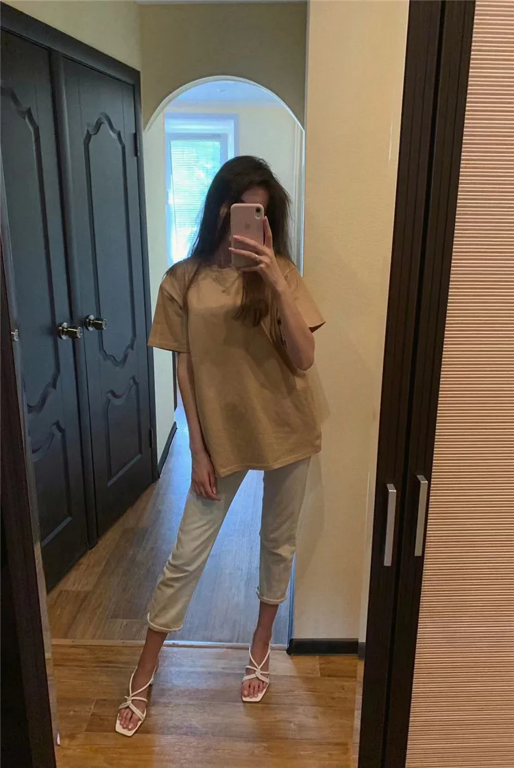Отличная базовая белая футболка. Плотный хлопок. У продавца указан полиэстер в составе, не знаю, по ощущению это 100% хлопок. Футболка оверсайз, сидит хорошо, отлично заправляется. Швы все ровные, запаха нет, легко гладится. Футболка не просвечивает (этим грешат многие белые топы с али). На фото показала, как сидит вживую. Рост 160, ог 83, от 60, об 93. Однозначно буду брать еще. Очень быстрая доставка - всего 12 дней. Спасибо продавцу!
