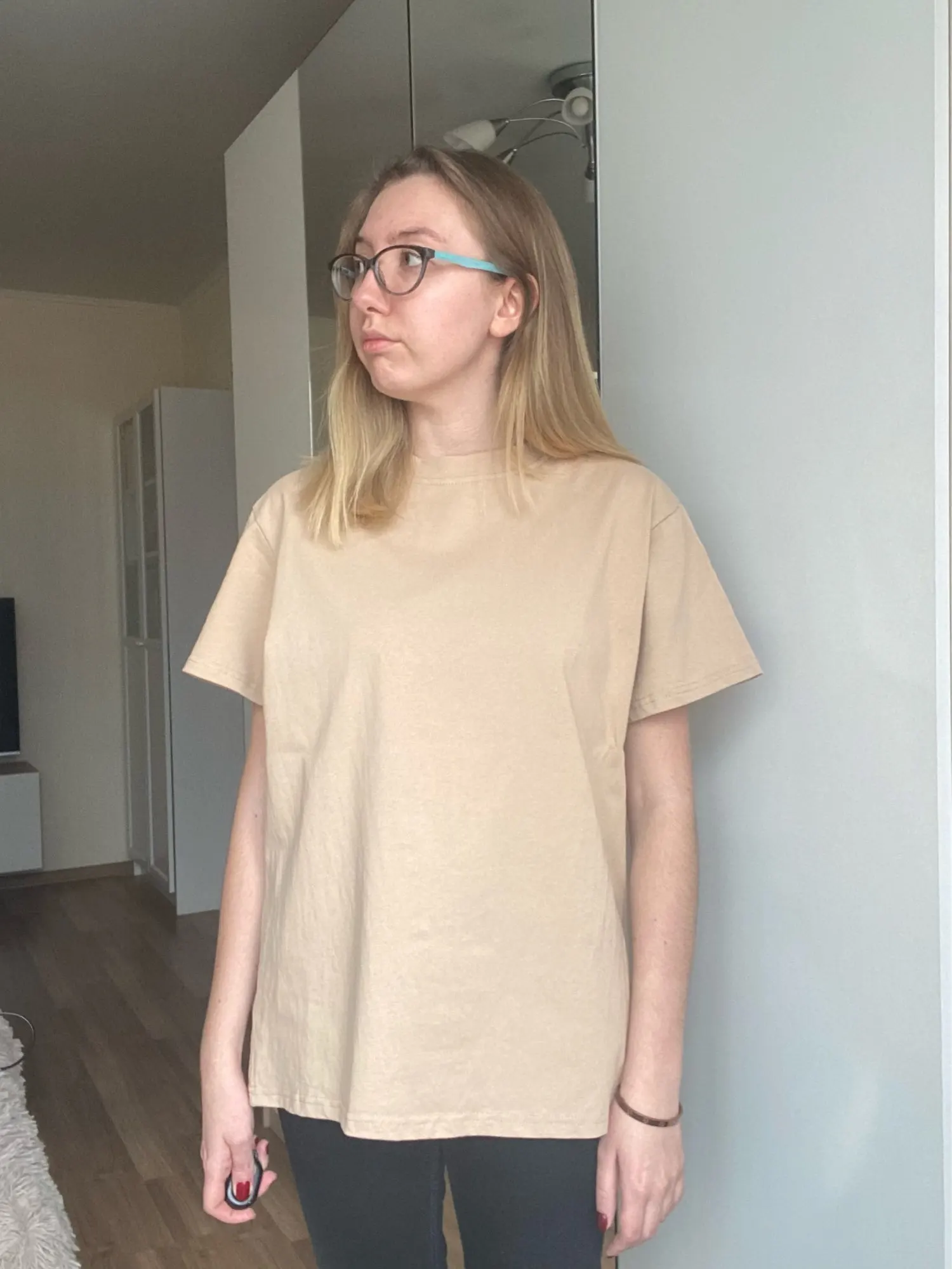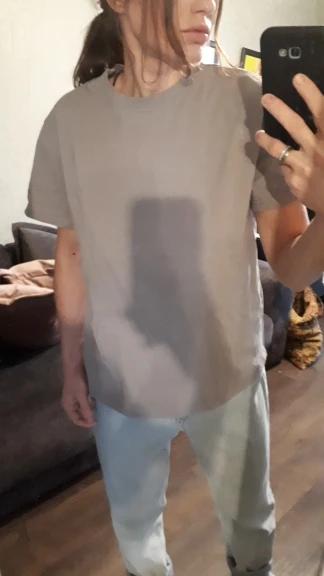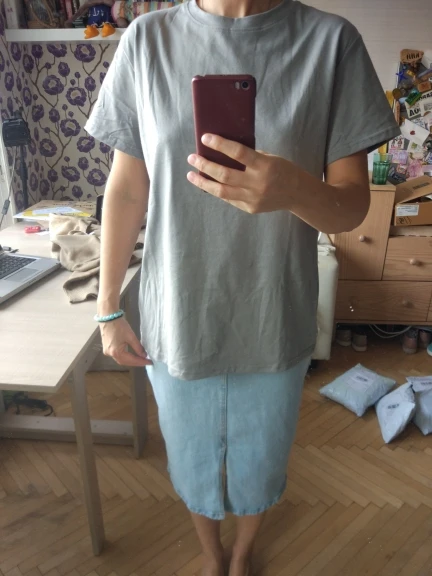 Футболка просто сказка! Ну никак не ожидала такого качества. Юникло отдыхает, отличный плотнейший хлопок, на размер 44 рус. отлично села оверсайзом, довольна как слон!!! Закажу тут ещё не один раз) (Сорри за мятую футболку, фоткала на скорую руку))