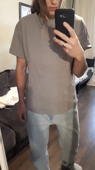 Хорошая футболка. Заказывала две (серую и бежевую) - доставка вышла бесплатной. Швы ровные, ничего не торчит. Цвет серой футболки, правда, на деле оказался темнее, чем на фото продавца. Но отправлять обратно не стала. Все равно довольно базовая. Длина отличная - можно носить и на выпуск, и заправить. Хороший ворот, не слишком глубокий. Возможно, закажу ещё голубую)