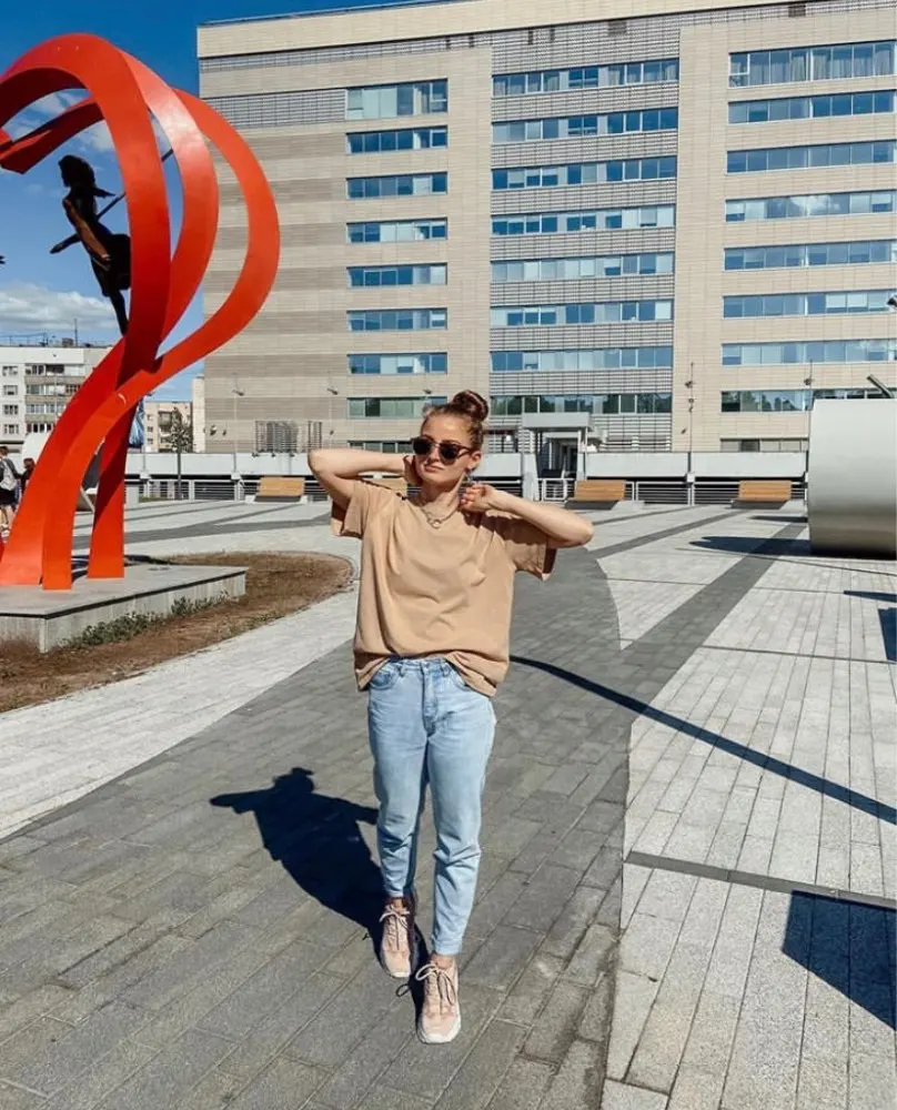Футболка супер. Качество отличное, настоящий хлопок. Держит форму хорошо. Выглядит как оверсайз, чуть удлиненная. Прям как сейчас в моде. Можно сочетать с разными вещами