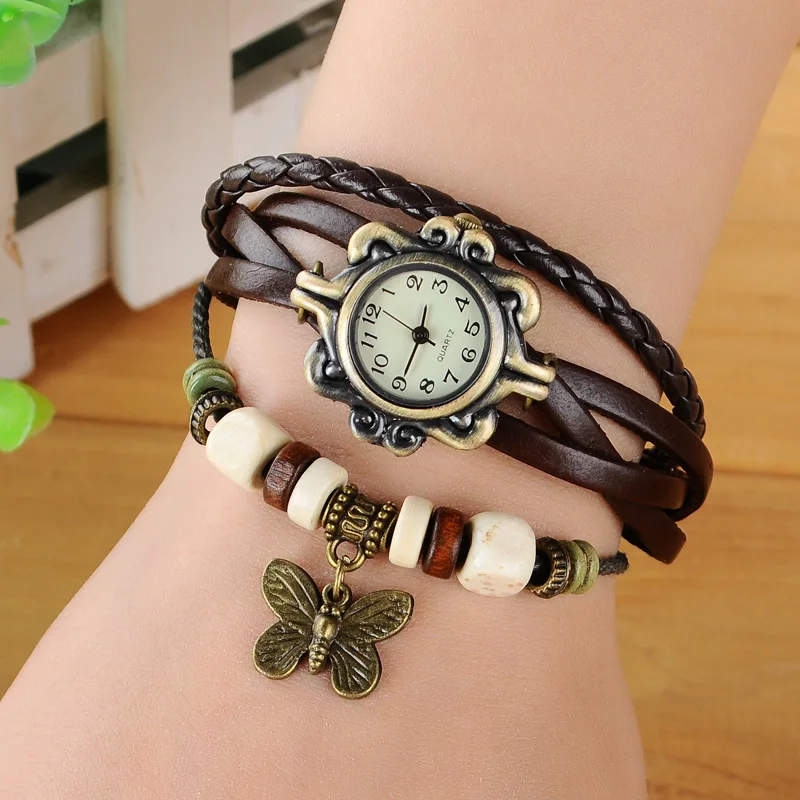2019 мода часы женские Корейский стиль винтаж Деревянные бусины бабочка подвеска женские часыИскусственная кожа Канаты часы женские наручные новый часы женские с браслетом часы наручные часы наручные женские