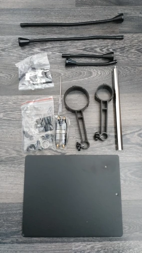 В целом набор неплох. В комплекте есть запасные крокодил и зажимной винт к нему, четыре ножки для установки по углам пластины, есть и мелкая отверточка. Гусаки, на мой взгляд, могли бы быть и более жесткими. Посмотрим, как они поведут себя через годик. Зажимные винты на кронштейнах крепления фена и для стопорения кольца на стойке пришлось обработать напильником, все они имеют выступающую острую кромку по торцу. Резьбу в отверстии стойки пришлось дорезать в глубину, иначе крепежный винт заворачивался лишь до половины. На резьбовых отверстиях для установки крокодилов и на отверстии с резьбой в кольце снял заусенцы. Понимаю, конец года - спешили очень ;)