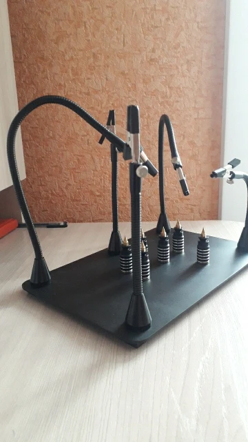 Купил вариант с держателем для фена, уже по факту понимаю что накой оно надо было ?)) Платформа тяжелая, на резиновых ножках. Магниты реально сильные как и гнущиеся держалки - удержат все, что не перевернет платформу. Для моих любительсих редких задач наверное надо было брать проще и дешевле, хорошо подумайте перед покупкой )) По косякам - резьба в стопорном кольце нарезана криво косо, с заусенцем. И доставка ДПД, тащится пришлось в другой район, т.к. рядом точек выдачи нет