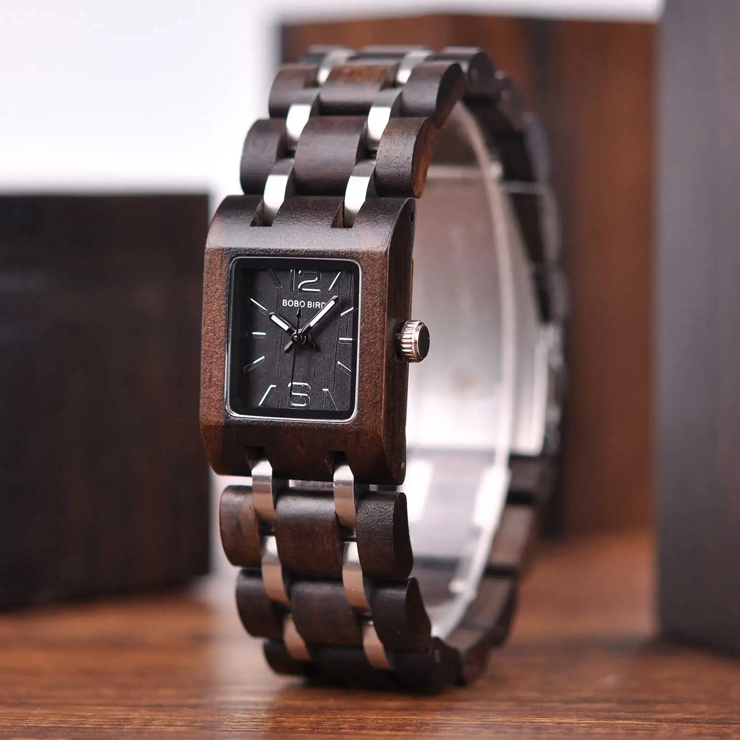 Деревянные женские часы, женские деревянные часы BOBO BIRD, наручные часы из бамбука, кварцевые квадратные в деревянной коробке, подарок для девушки, подруги