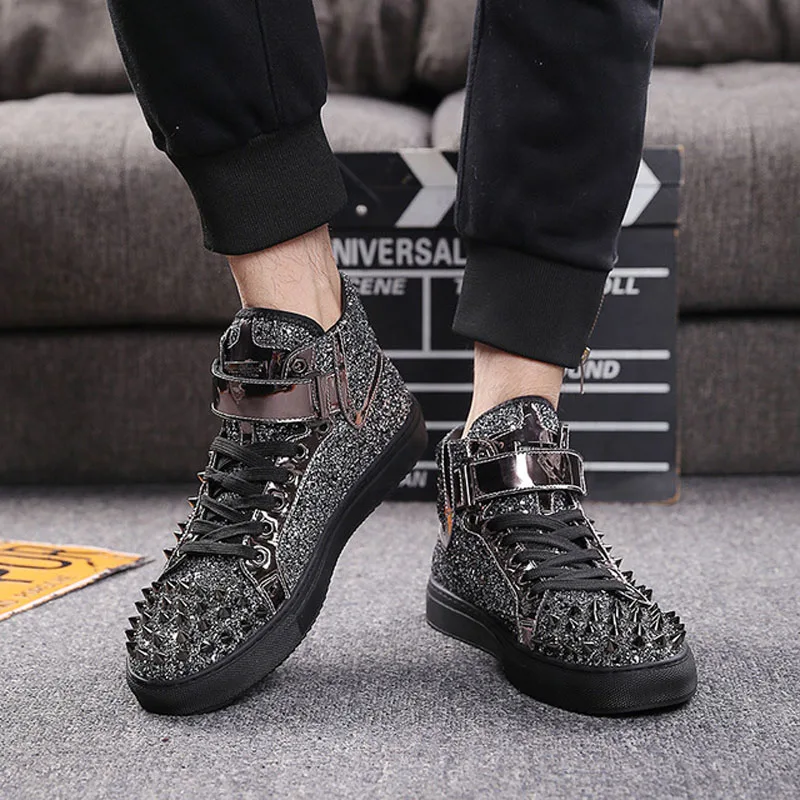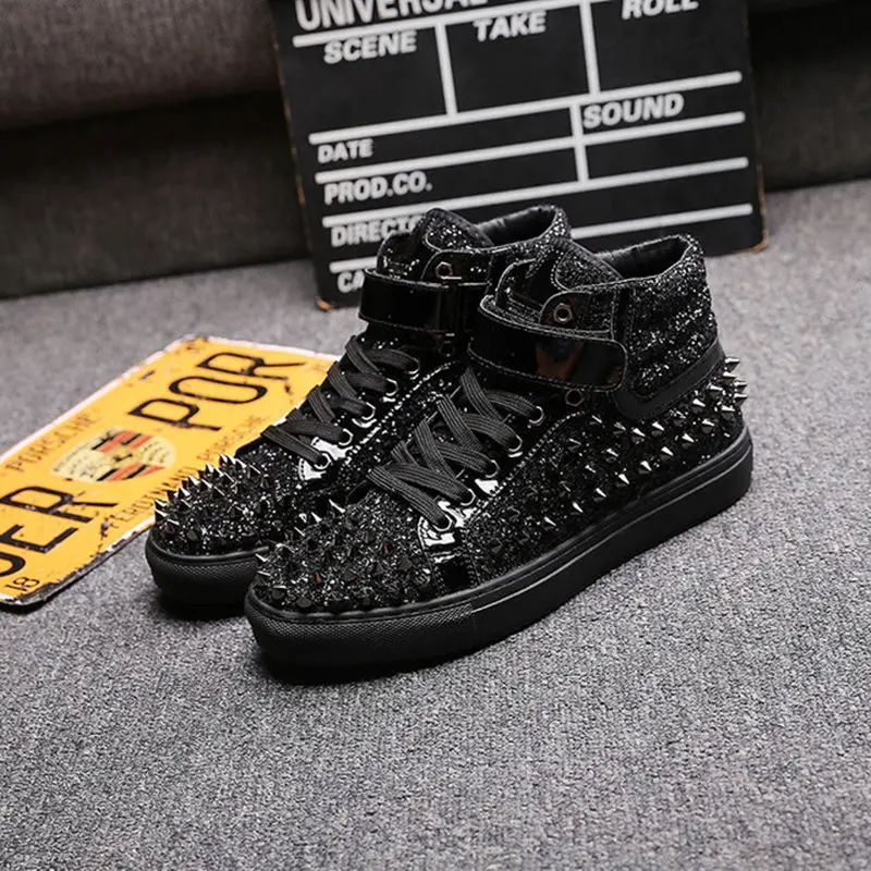 Мужские высокие кроссовки с заклепками, черные, серебристые кожаные кроссовки с шипами, повседневная обувь на плоской подошве для улицы