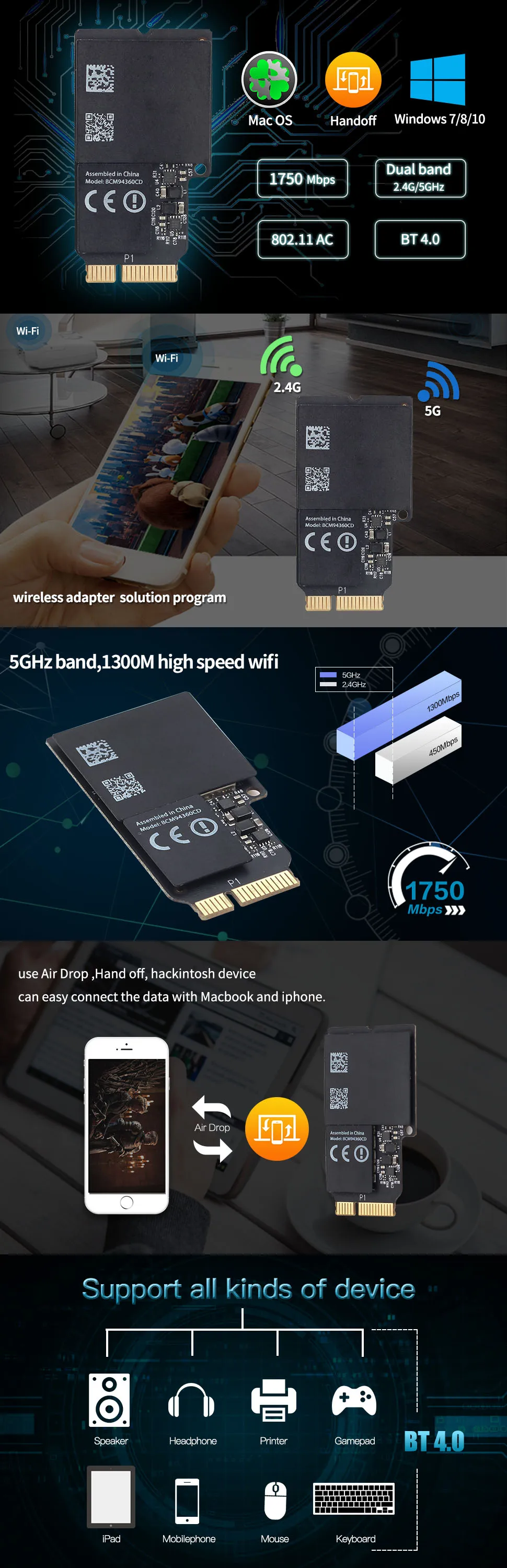 Двухдиапазонная Wi-Fi Bluetooth карта 1750 Мбитс 2,4 ГГц5 ГГц BT 4,0 Broadcom BCM94360CD беспроводной модуль для Apple Hackintosh Mac OS