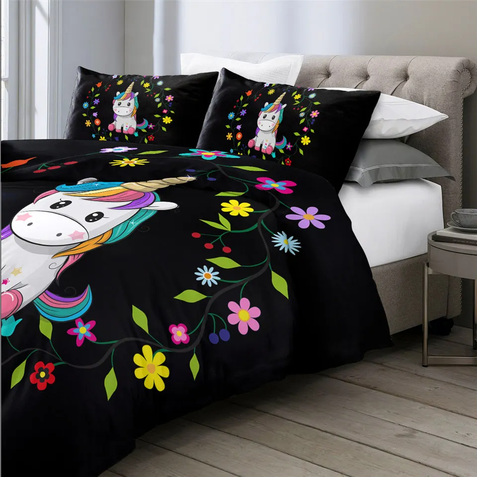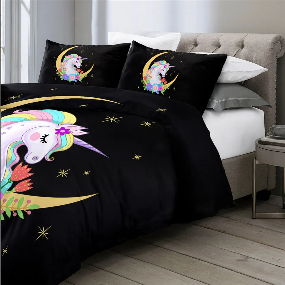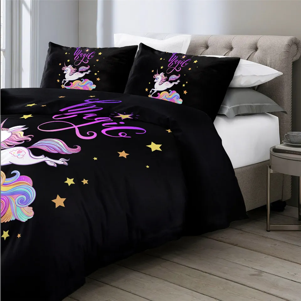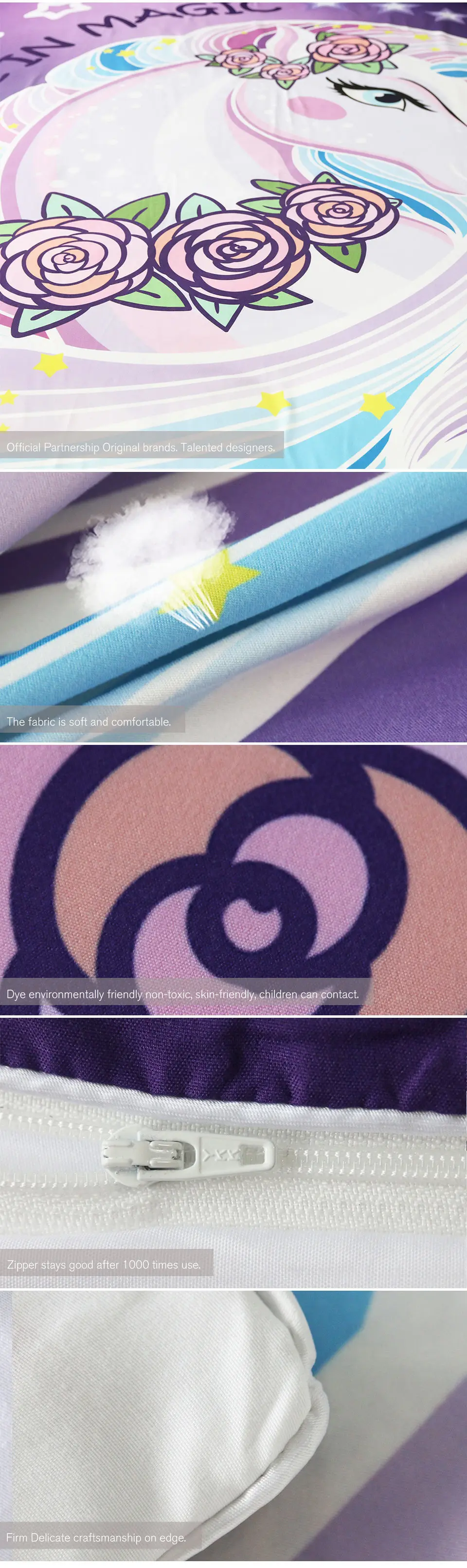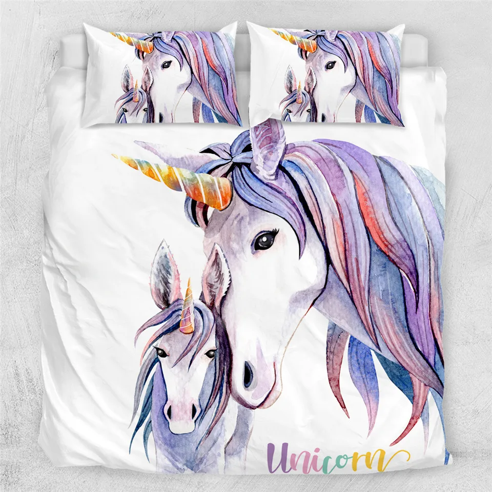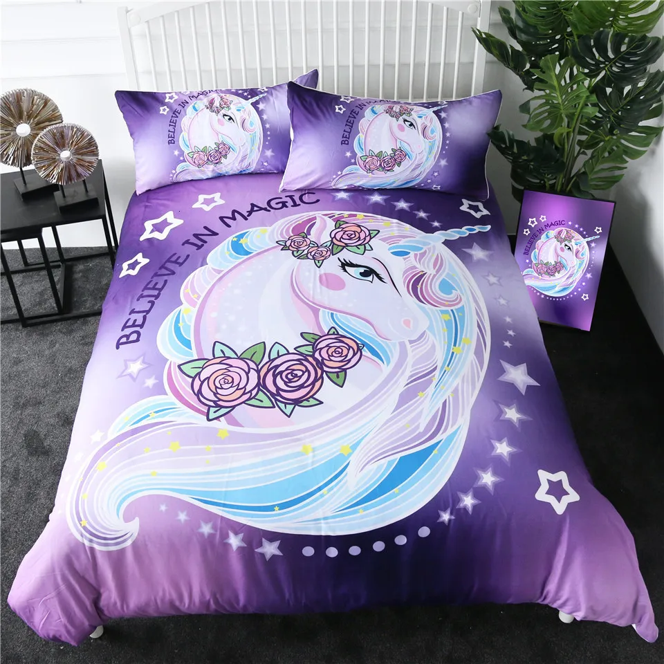 Комплект постельного белья с изображением единорога из мультфильма, Комплект постельного белья для детей, пододеяльник с розами, пододеяльник для девочек, домашний текстиль, фиолетовая постельное белье, 3 предмета, Прямая поставка