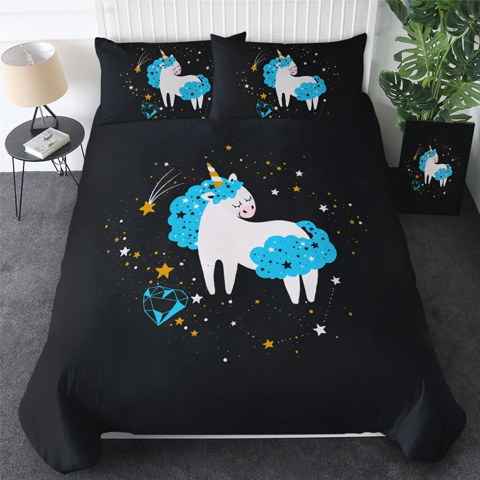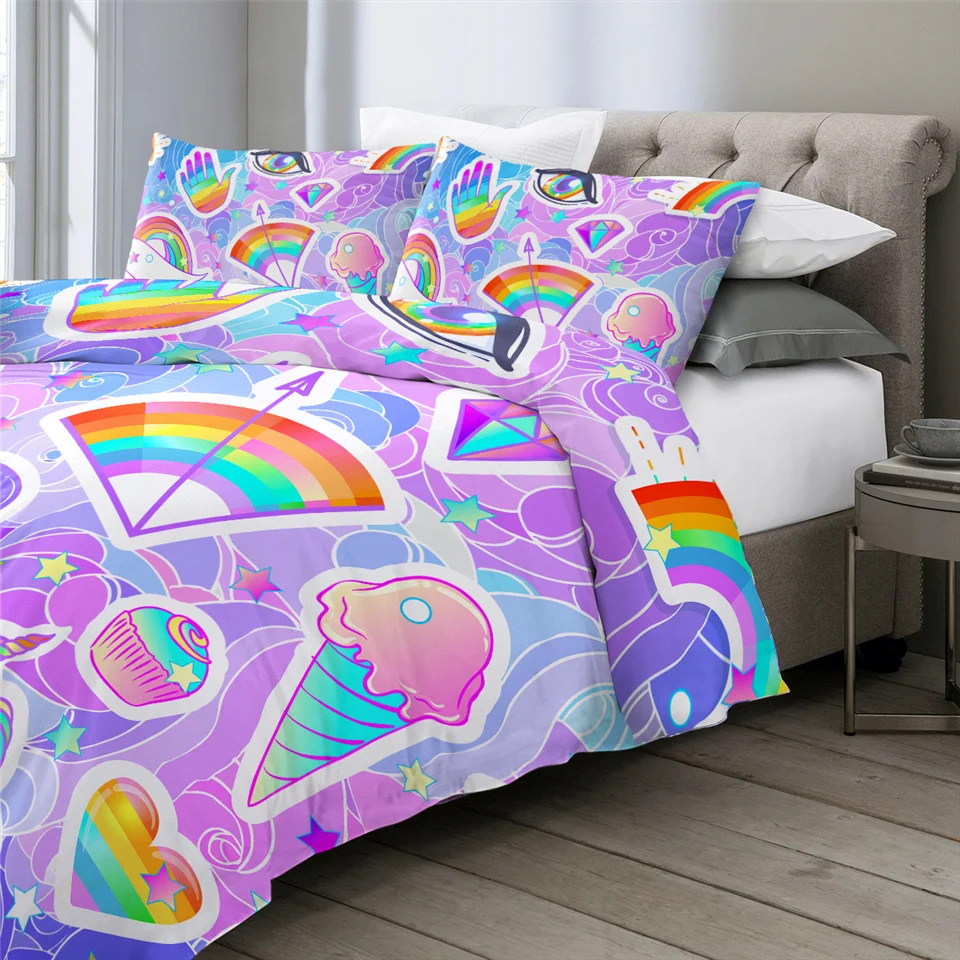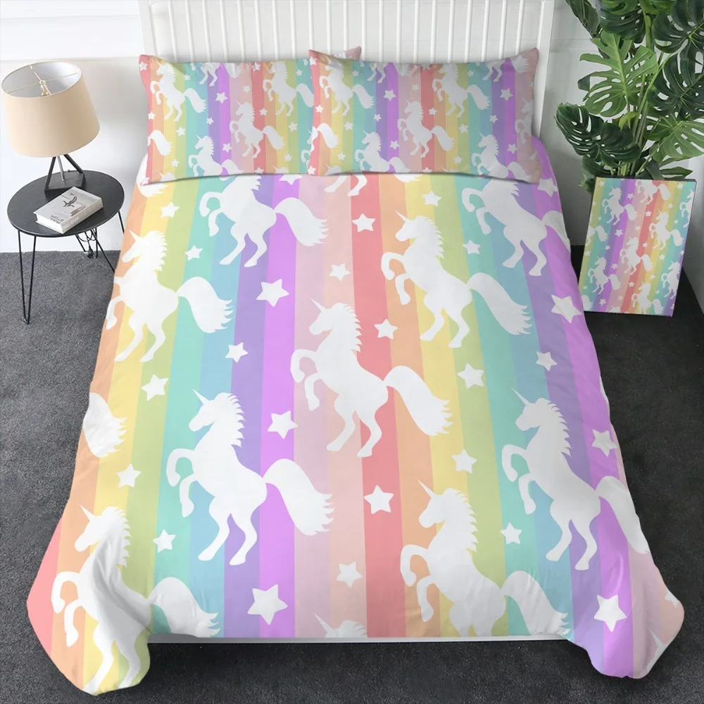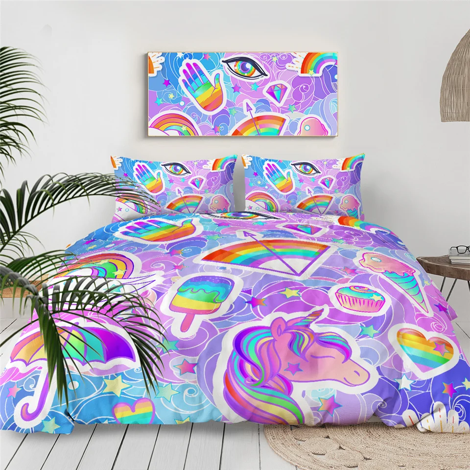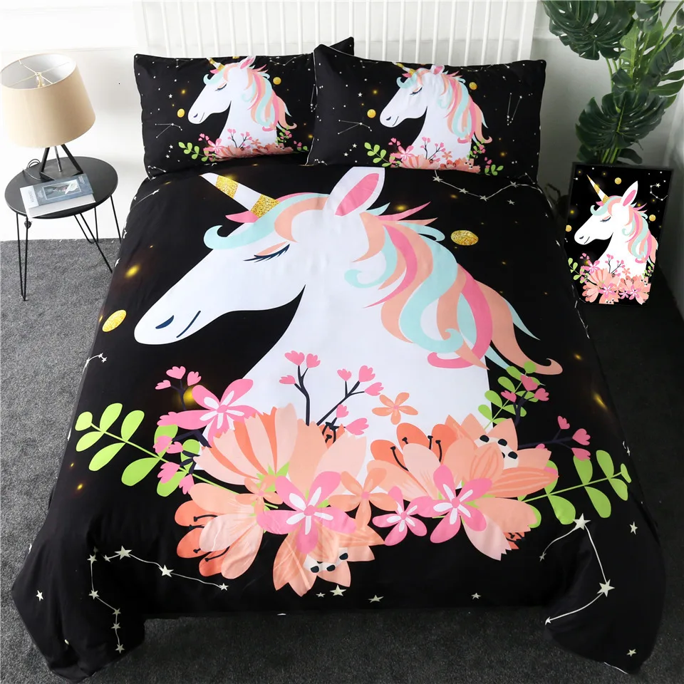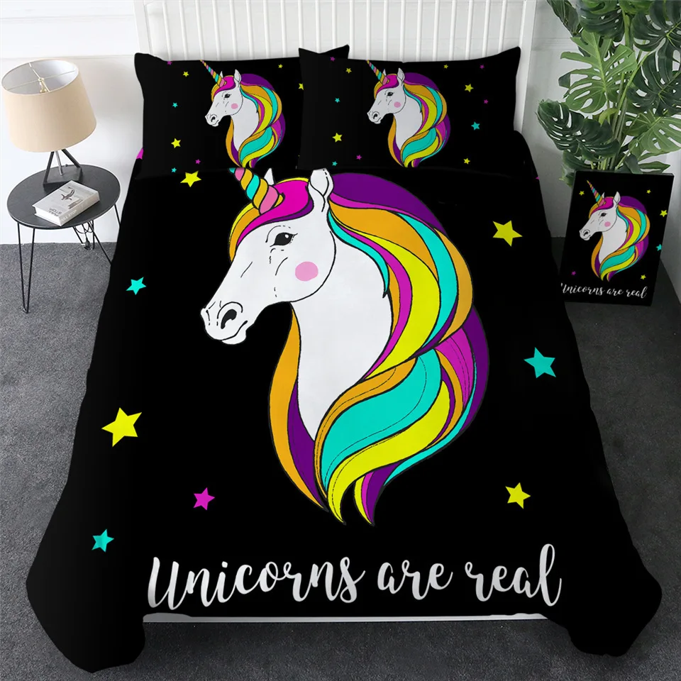 Комплект постельного белья с изображением единорога из мультфильма, Комплект постельного белья для детей, пододеяльник с розами, пододеяльник для девочек, домашний текстиль, фиолетовая постельное белье, 3 предмета, Прямая поставка